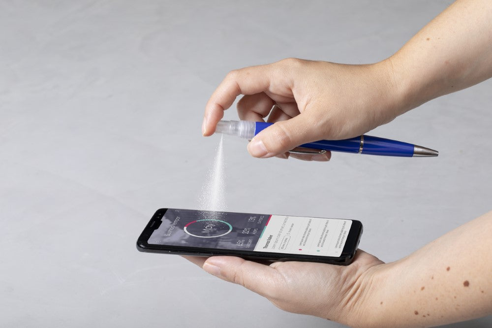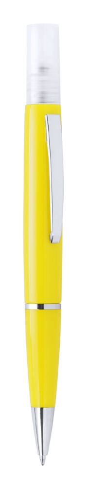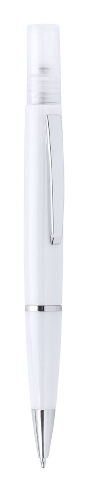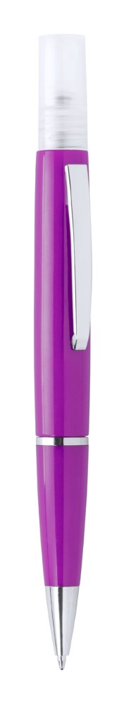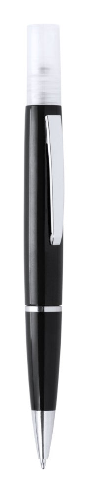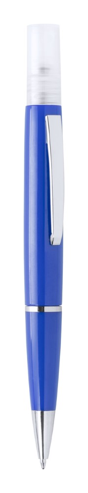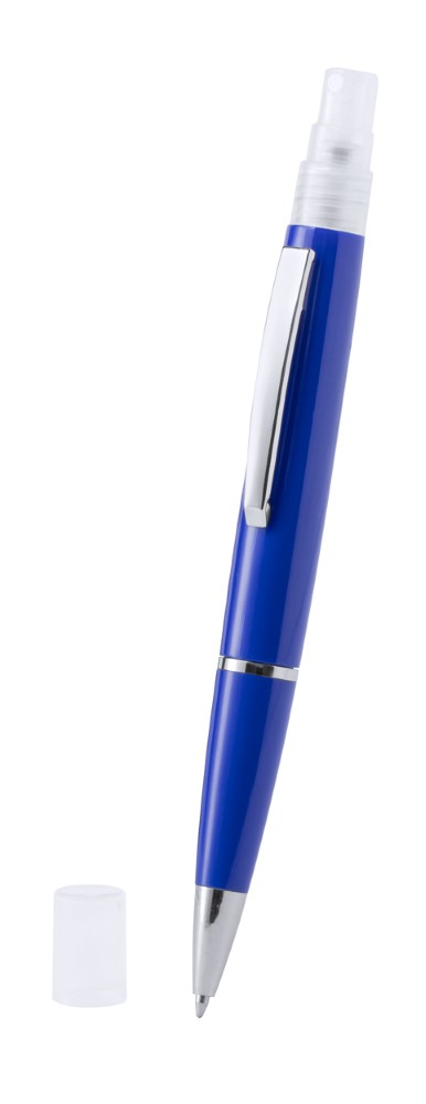 Plastični kemični svinčnik z modrim polnilom in razpršilom za razkužilo na vrhu. Prostornina: 3 ml. Dobavljivo brez razkuževalne tekočine.