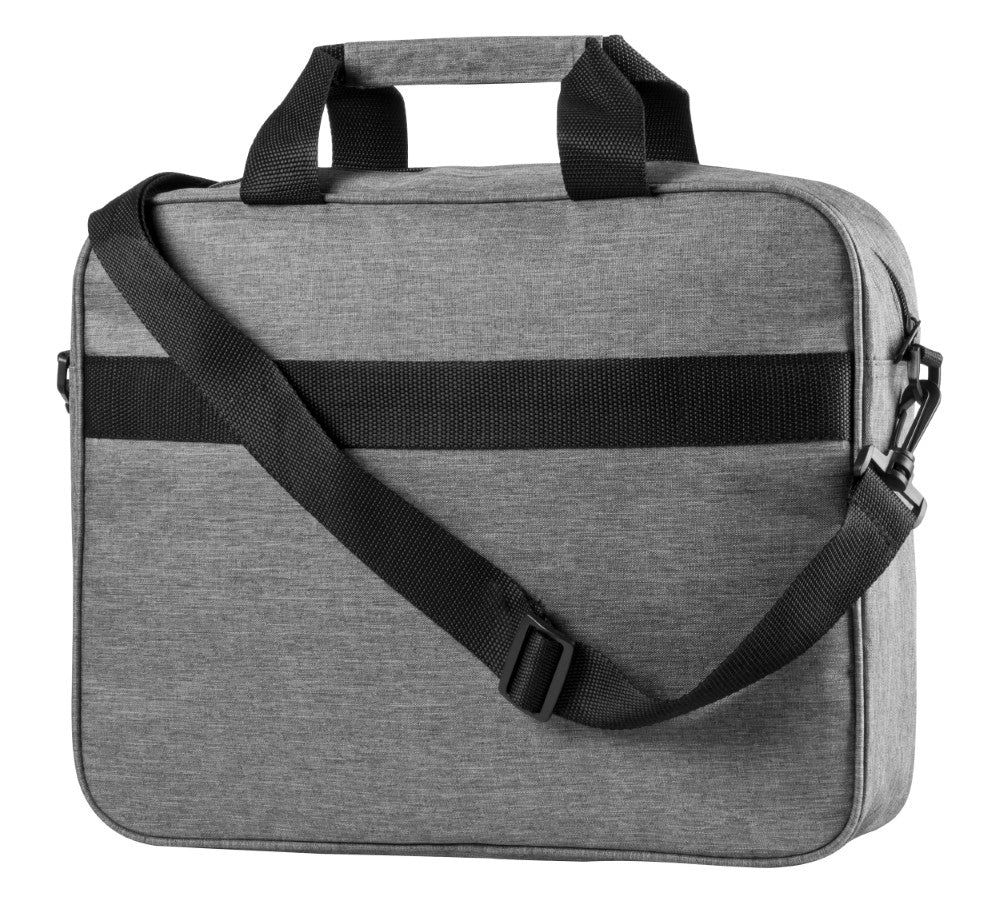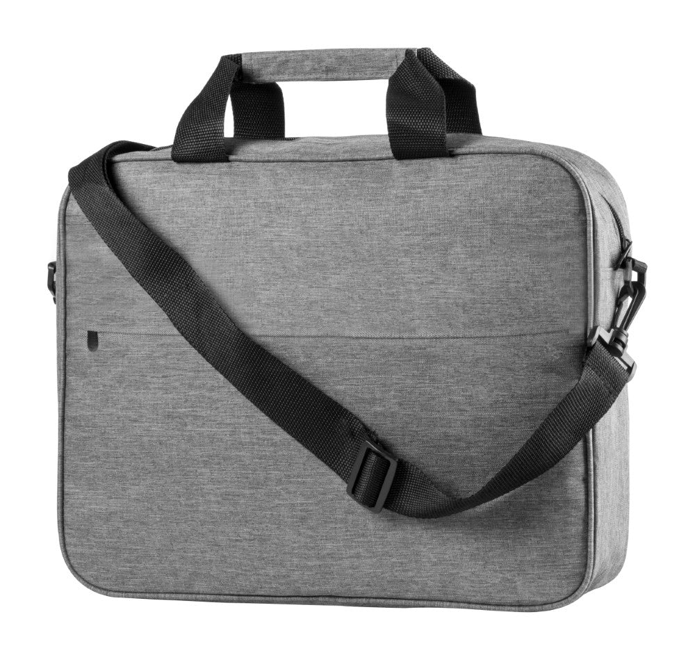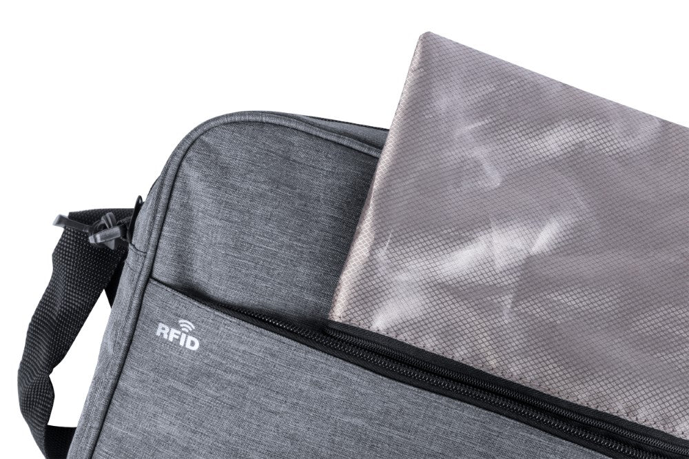 Poslovna torba, RFID zaščita, s predeloma za prenosnik in tablico, na zadrgo, roč in trak za nošenje čez ramo in obešanje na voziček s kolesi, vgrajen USB konektor, siv poliester, 380x295x85mm