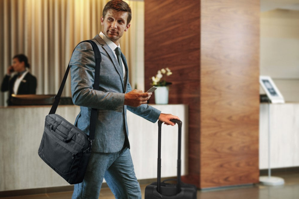 Večnamenska torba z zadrgama - črna, dva veika predela in več žepi in predeli, trak za nošenje in trak za obešanje na voziček, meliran poliester 600D, 41x29x8cm, PU vrečka