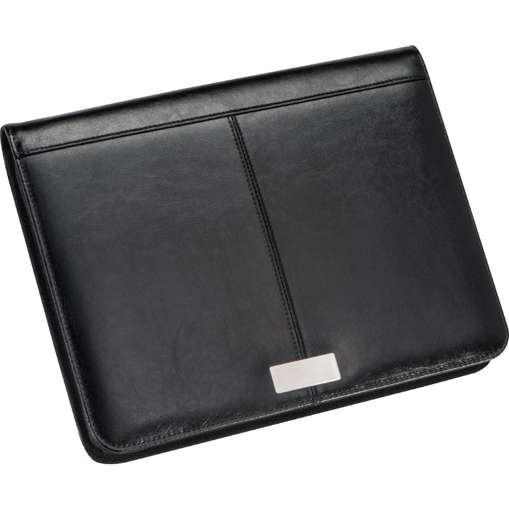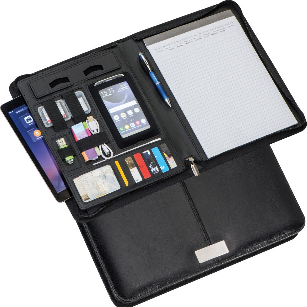 Mapa A4, črna, kvalitetna imitacija usnja, z zadrgo, 30 listni blok s črtami, žepek in stojalo za telefon ali tablico in drugimi žepki, brez vsebine, 255x337x30mm, PU vrečka