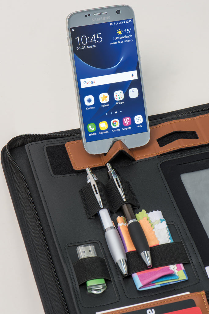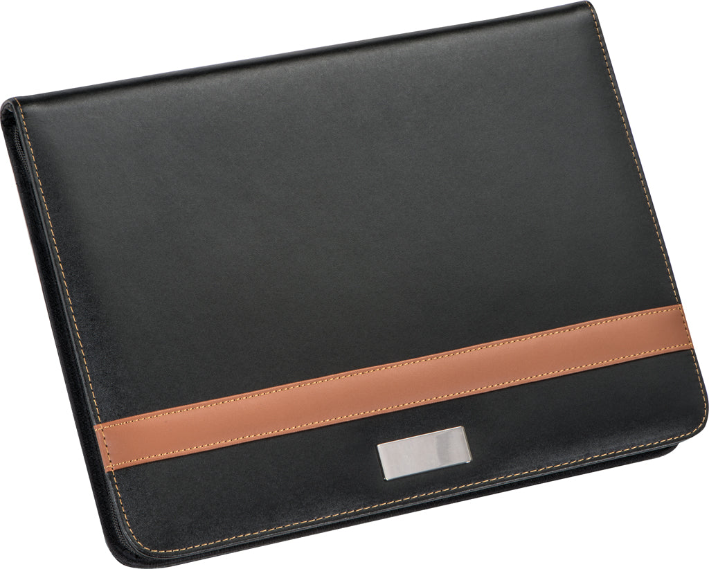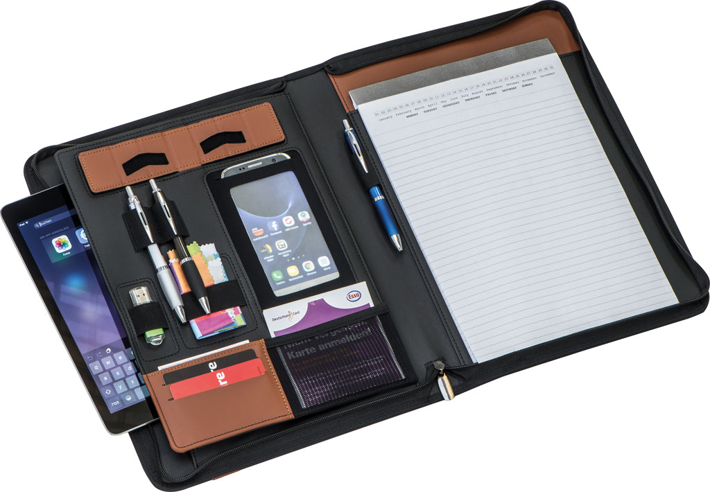 Usnjena mapa z zadrgo, dvobarvna, s 30 listnim A4-blokom, z žepom za tablico ali notebook, pameten telefon in drugimi malimi žepki, brez vsebine, 270x349x40mm, PU vrečka