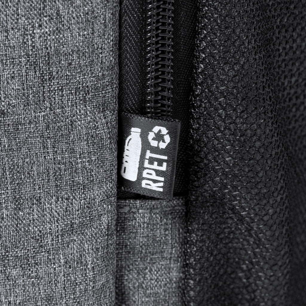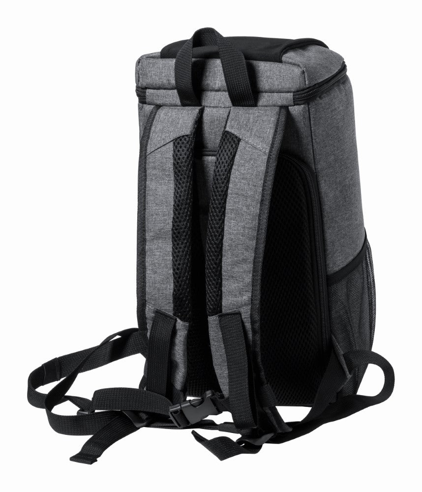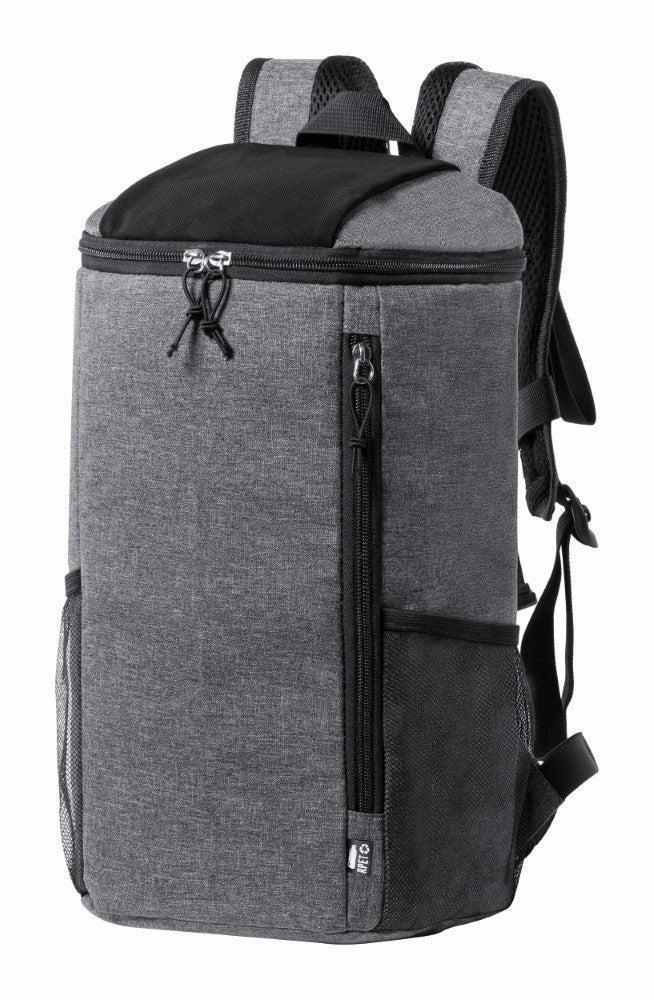 Hladilni nahrbtnik, RPET poliester 600D melirane sive barve, z več žepi in predelom na zadrgo, dva mrežasta žepa, podložen ramenski trak, 38x21x17cm