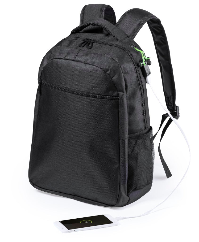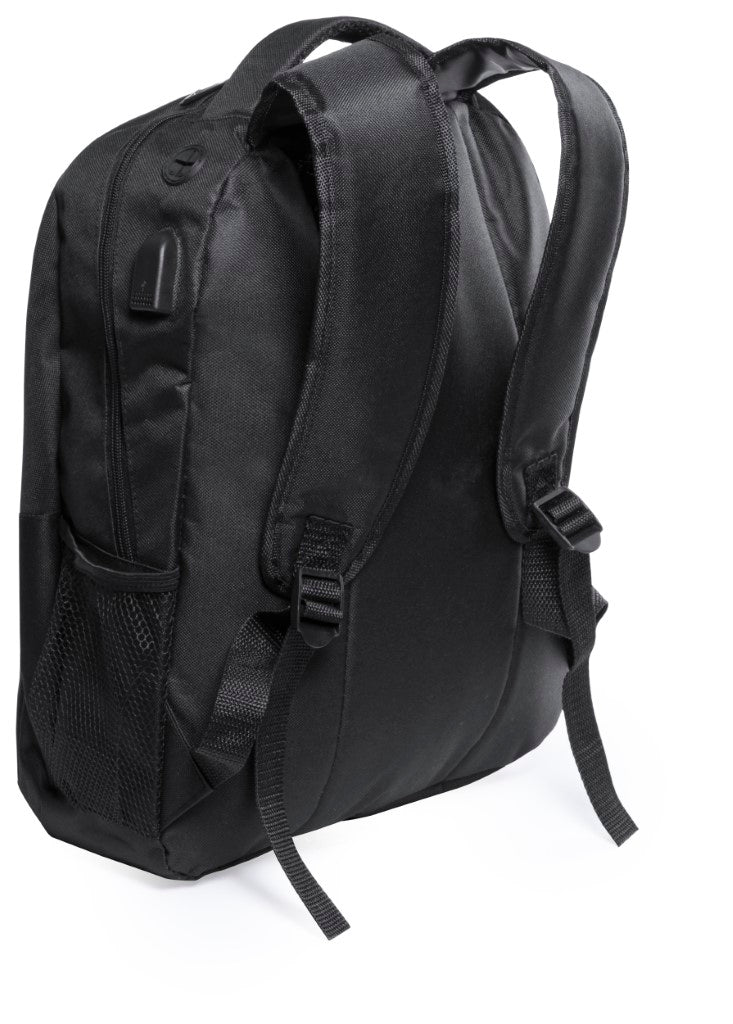 Nahrbtnik - vodoodporen, črn 600D poliester, podložene naramnice in hrbtišče, več žepov na zadrgo, žepa za prenosnik (15+M724") in tablico(10"), izhod za slušalke, USB konektor za prenosnik, 32x42x15cm