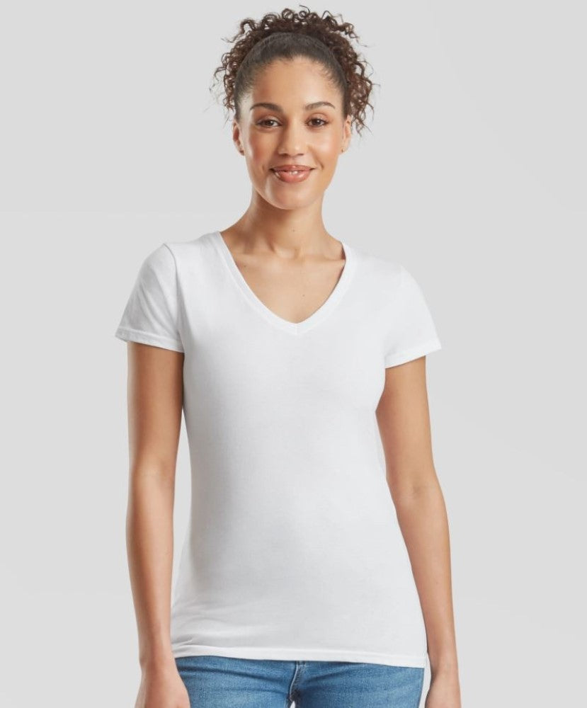 Ženska majica, 100% bombaž, 165g/m2, telirana z V izrezom, kratek rokav, podaljšana