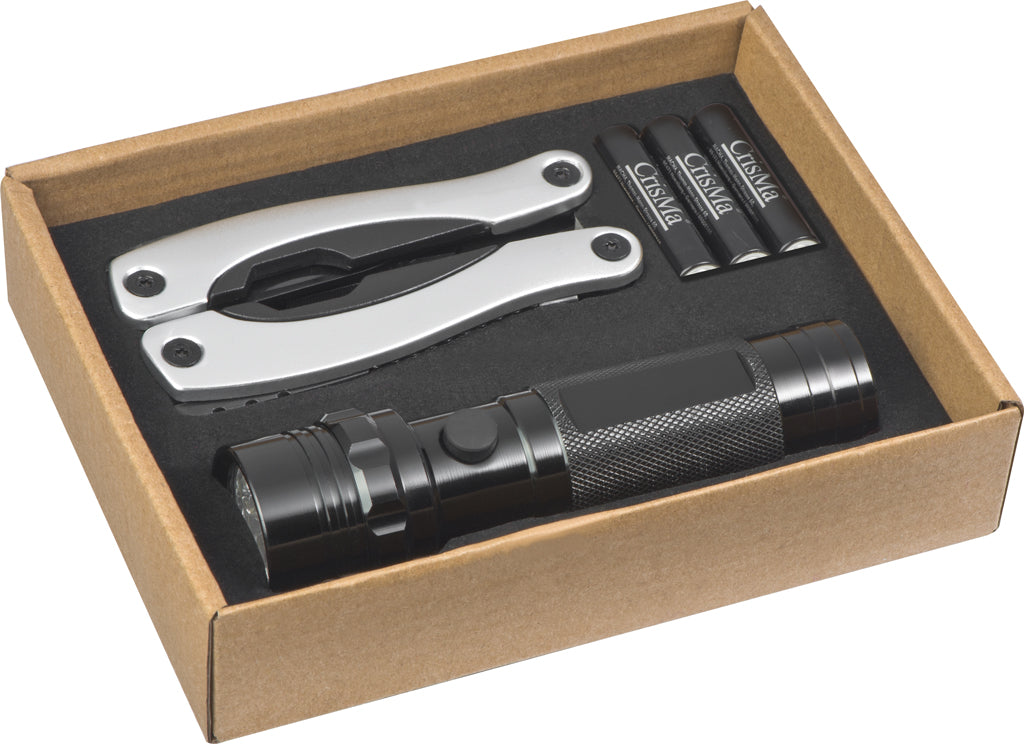 Set - dvodelni, kovinska 14 LED svetilka in večnamenske klešče 9-delne, 12 funkcij, darilna škatla: 171x130x38mm