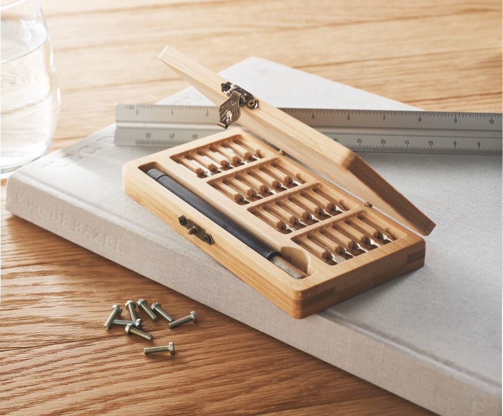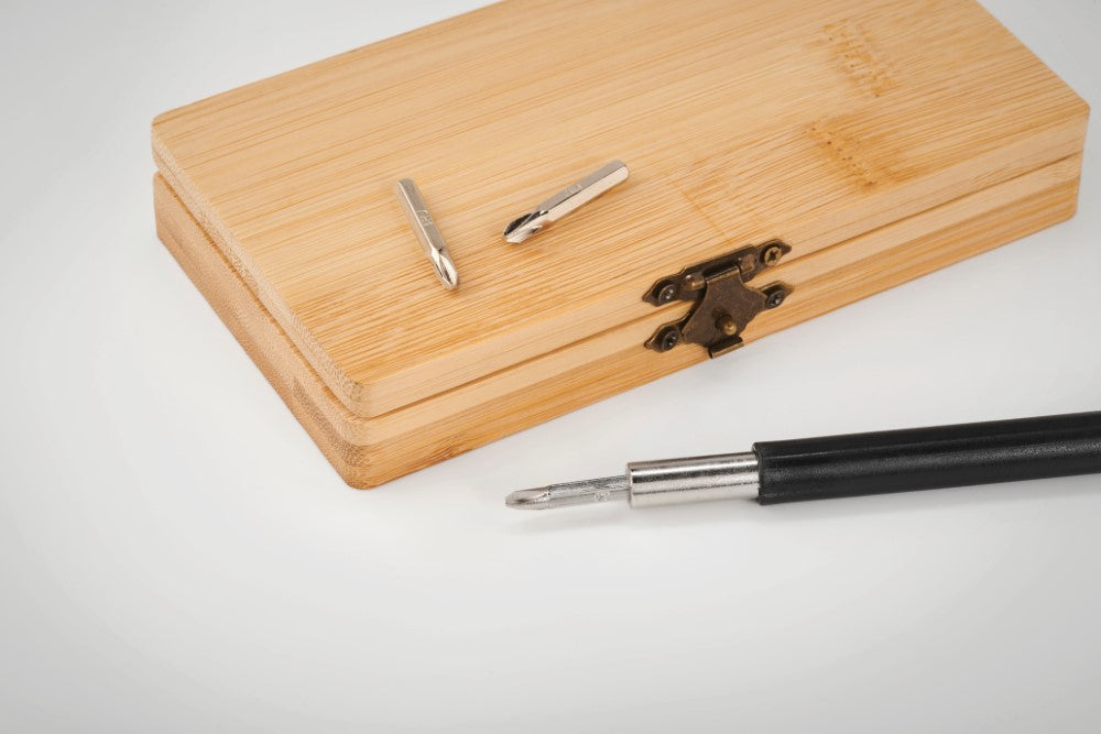 Set finomehaničnih izvijačev-24 delni, v bambus škatli: 150x80x25mm, kartonska škatla