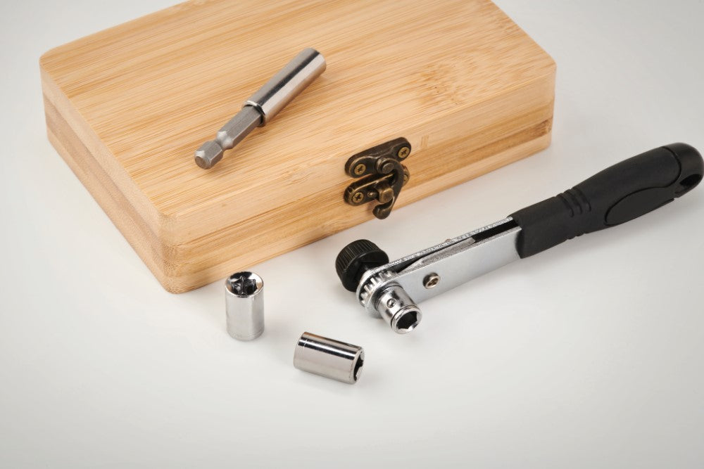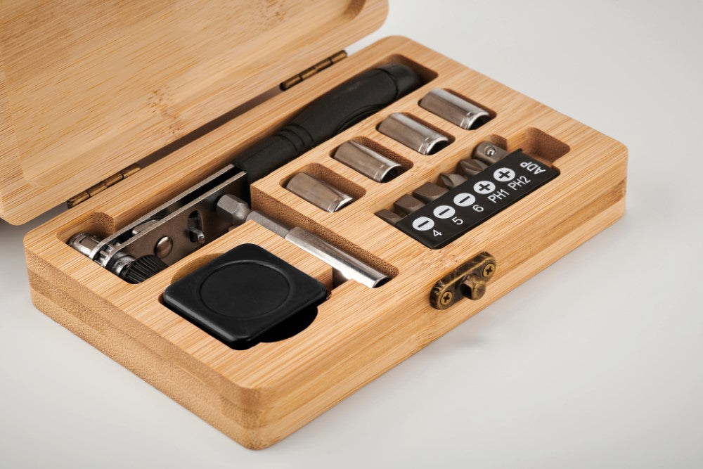 Set-orodja-13 kosov, v elegantni bambus škatli, adapter za 5 izvijačev in konektor za 4 nastavke ( 7mm, 8mm, 9mm, 10mm) ter merilni trak, kartonska škatla: 145x93x32mm