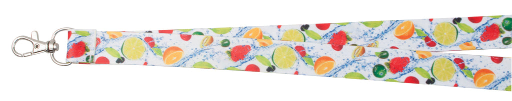 Ovratni trak z večbarvnim sublimacijskim tiskom na obe strani, tisk vračunan v ceni, minimalna količina 100 kosov, poliester, s kovinskim karabinom, 2 opciji širine traku (15 ali 20 mm)
