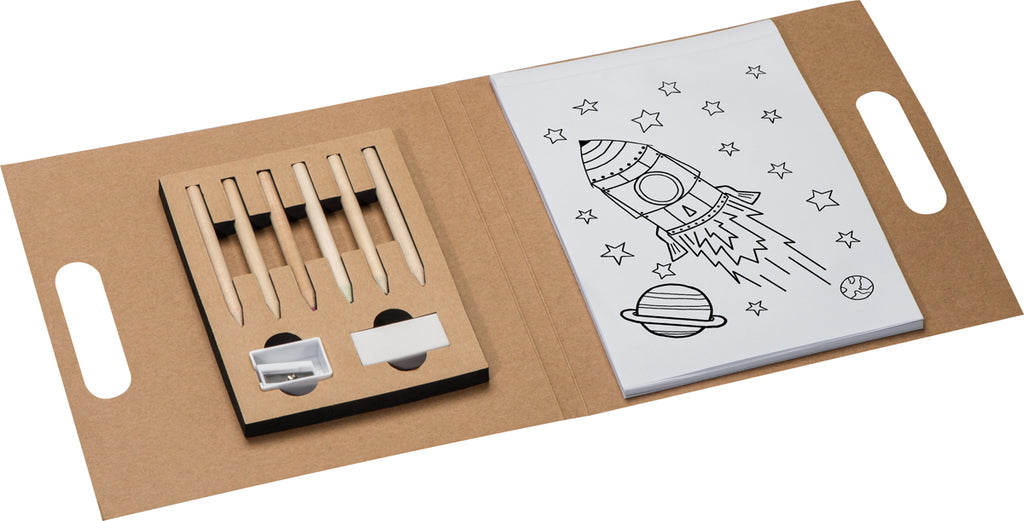Sat za barvanje, 6 barvic, šilček, radirka in blokec s 30 risbami, mapa z ročem: 210x 205x10mm, vrečka