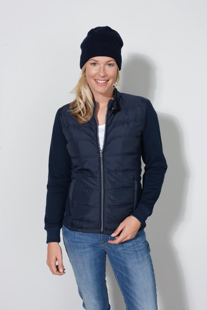 Ženska športna jakna, tanka, 20% poliester in 80% bombaž, 280g/m2, notranji del: 100% poliester, 2 zunanja žepa z zadrgo in 2 notranja žepa, telirana