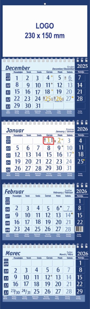 Štiridelni belo-moder koledar-špirala, mere odprtega: 245x850mm, papirnata vrečka