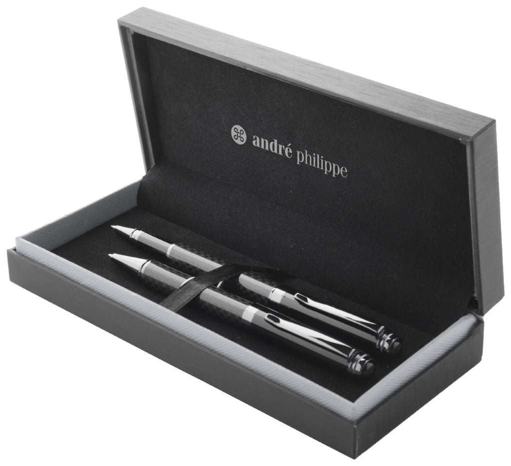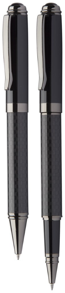 Pisalni set, dvodelni, kovinska kemični svinčnik in roler v črni barvi z vzorcem, darilna škatlica: 175x51x21mm