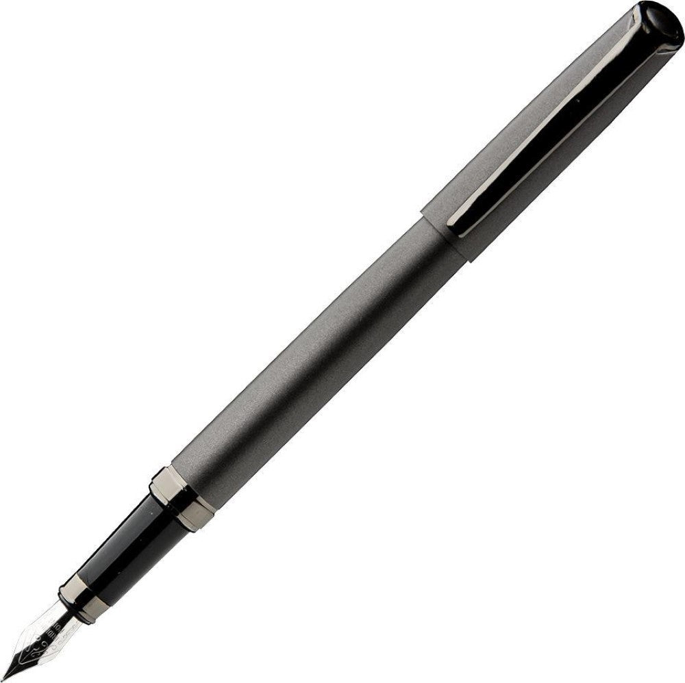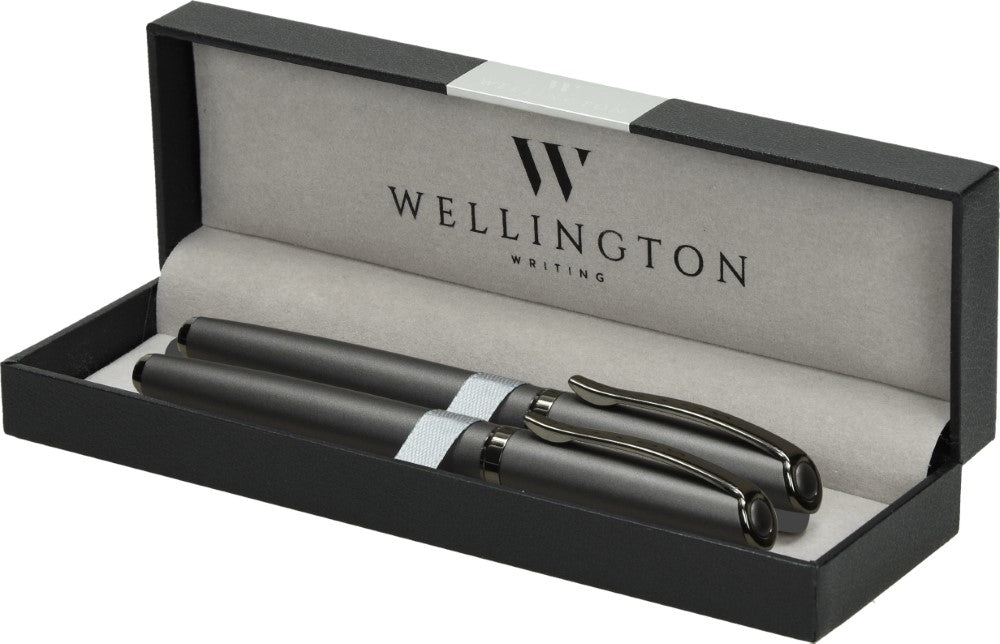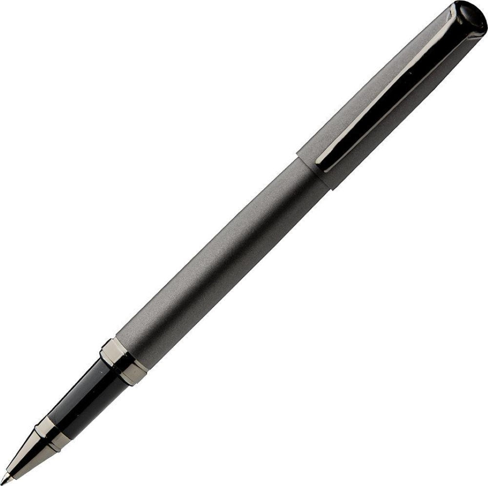 Eleganten pisalni set, nalivno pero in roler, mat kovinski deli, v črni darilni škatli: 180x55x30mm