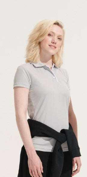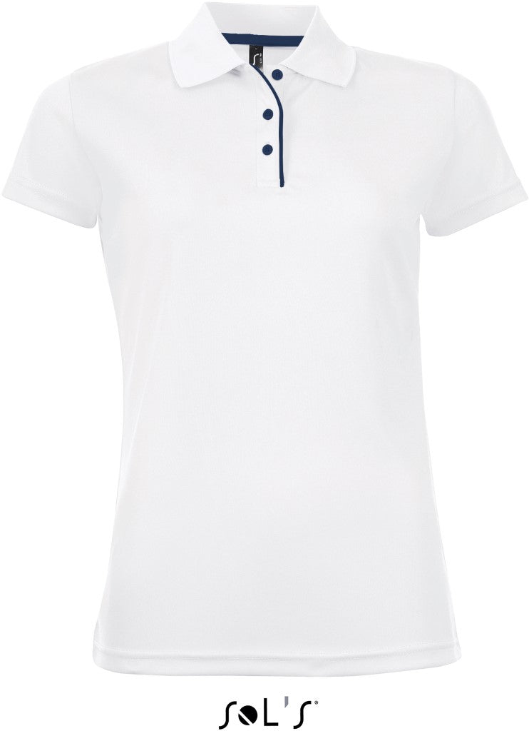Ženska športna polo majica, 100% poliester, 180g/m2, kontrastna barva obšiva in gumbov, odvaja vlago in znoj, se hitro suši, kratek rokav, telirana
