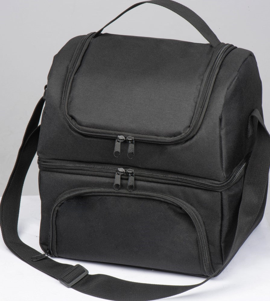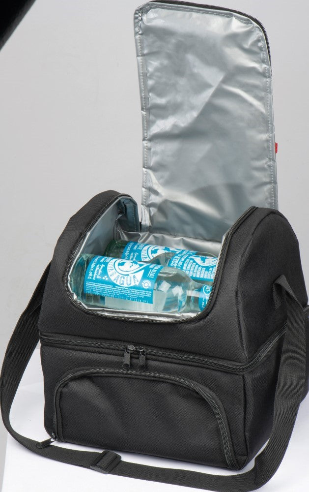 Hladilna torba 15L, dva predela in dodaten žep, vse z zadrgo, reciklran RPET 600D črn poliester, 200ml posoda za hrano, ramenski trak in roč, dodatna izolacija aluminij folija 2mm, 275x220x290mm