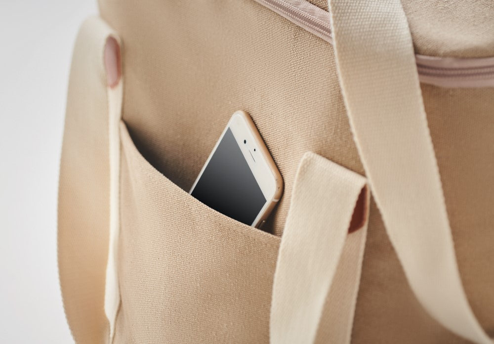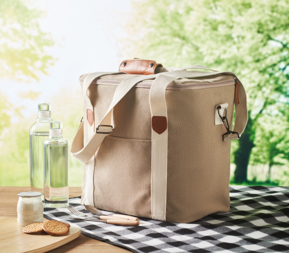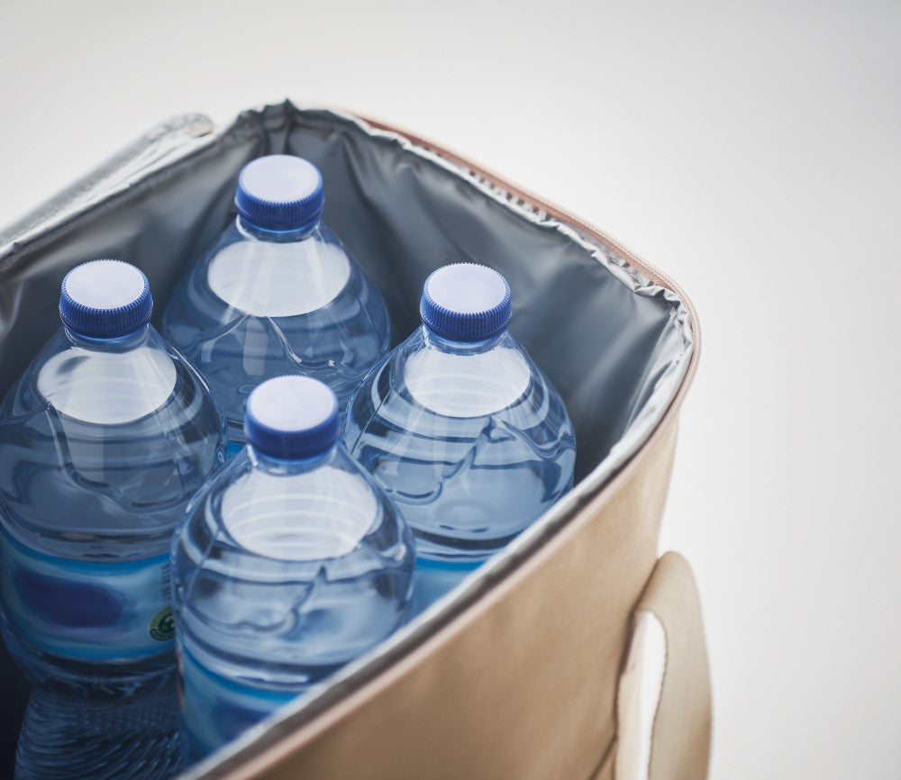 Hladilna torba 30L z zadrgo, kanvas 450g/m² naravne barve, penasta izolacija 6mm, ramenski trak in roč robustni bombaž, 350x350x250mm