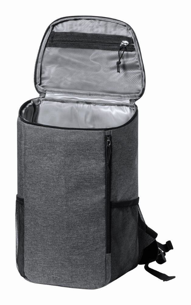 Hladilni nahrbtnik, RPET poliester 600D melirane sive barve, z več žepi in predelom na zadrgo, dva mrežasta žepa, podložen ramenski trak, 38x21x17cm