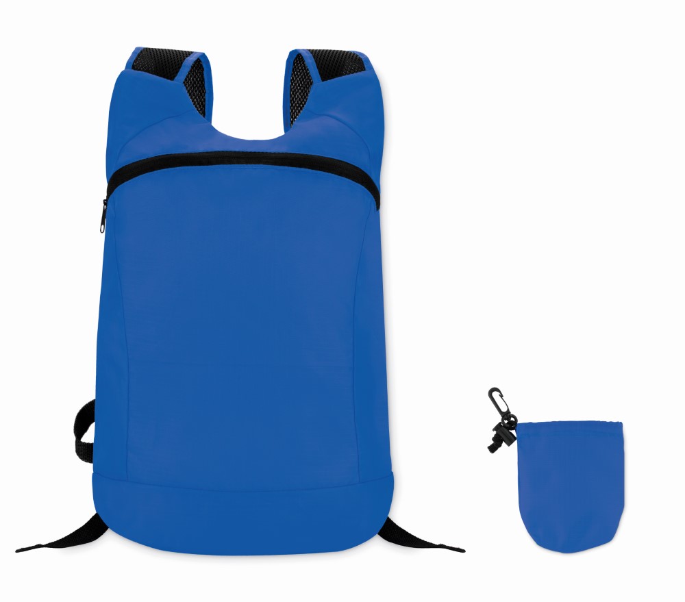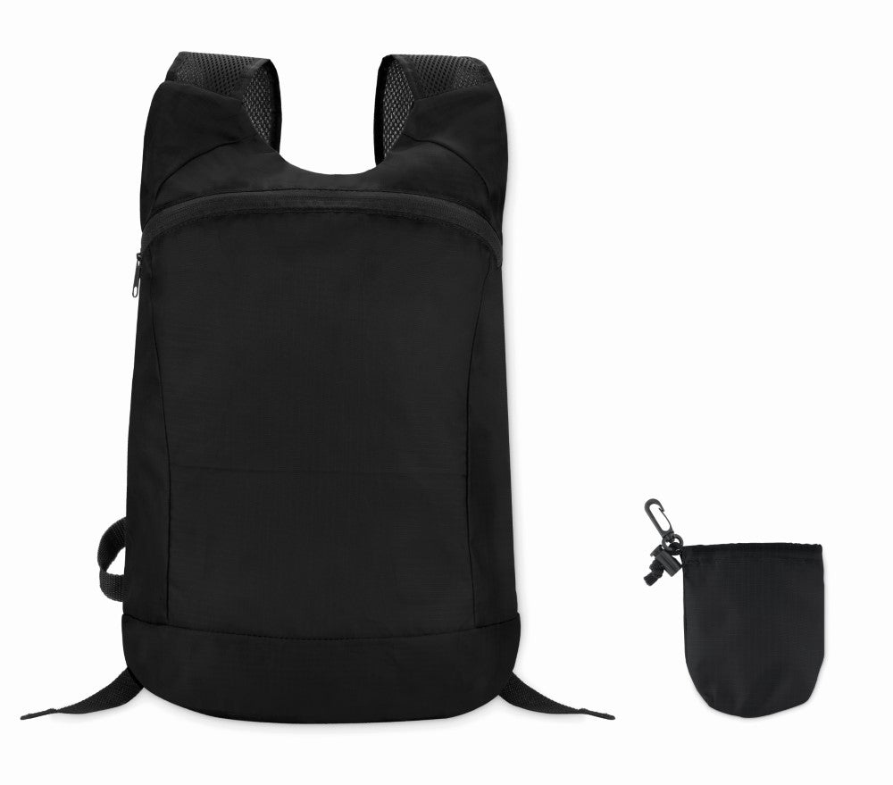 Zložljiv športni nahrbtnik z zadrgo in mrežastimi naramnicami, zložen v vrečki s karabinom, trpežen mehek poliester, 295x110x420mm