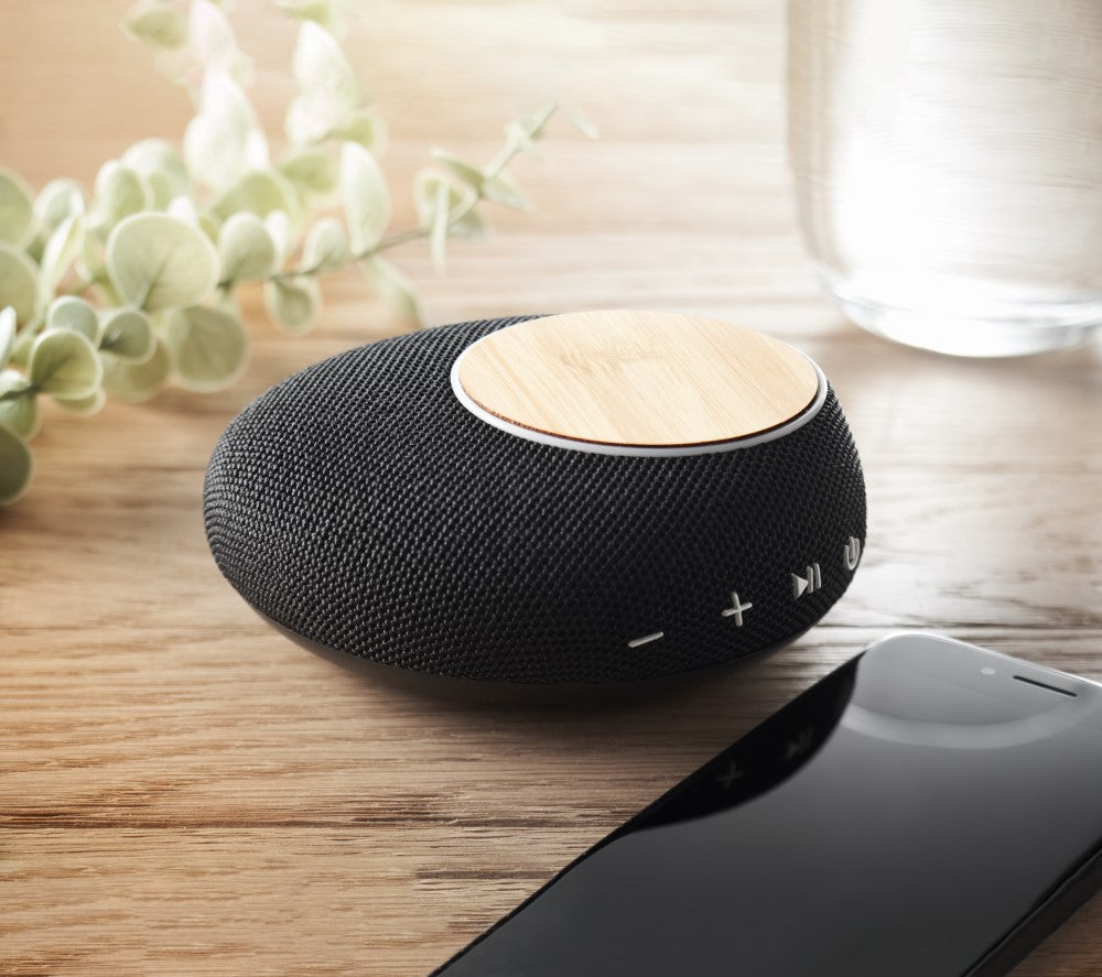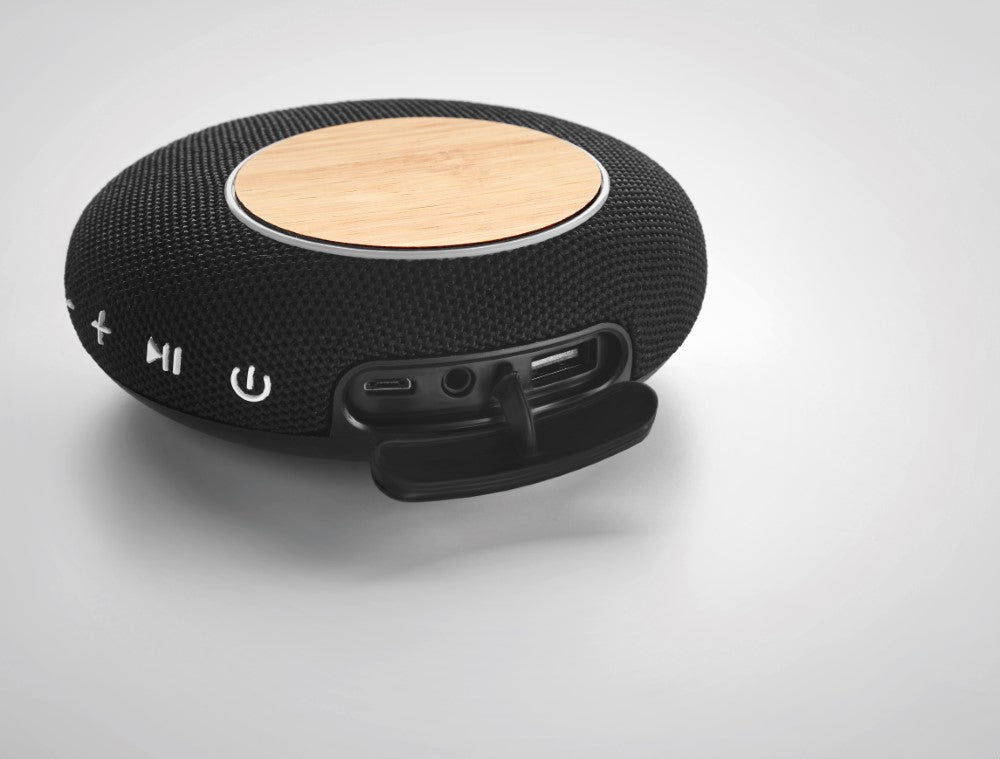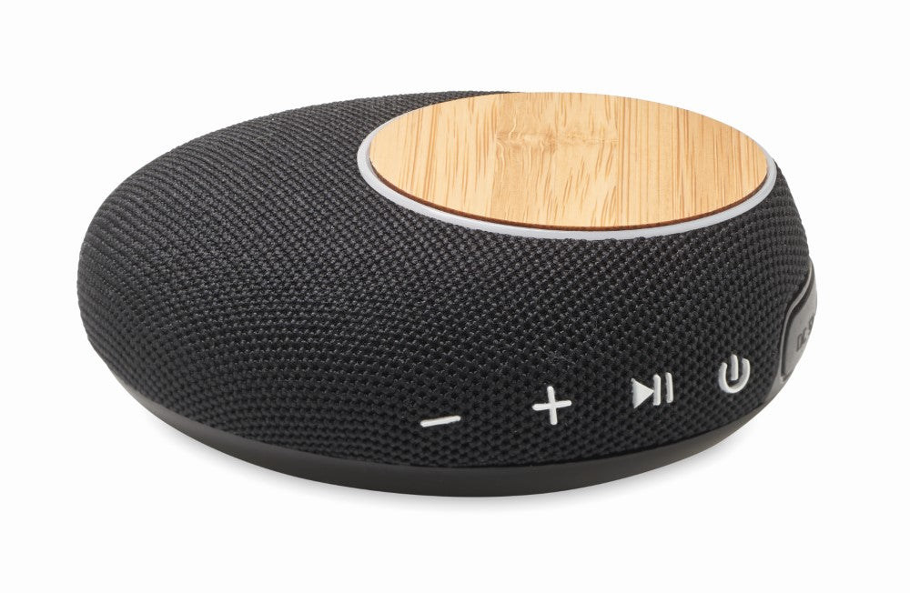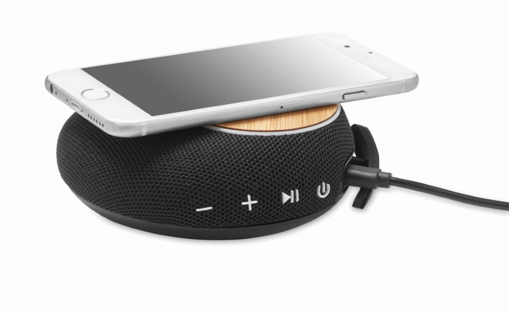 Brezžični polnilec, 5.0 brezžični soundbar zvočnik, ABS črna plastika in bambus, izhod(10W), 4.000 mAh Li-ION baterije vgrajene, kvaliteten bluetooth zvočnik, priloženi kabli, Ø114x42mm, darilna kartonska škatla