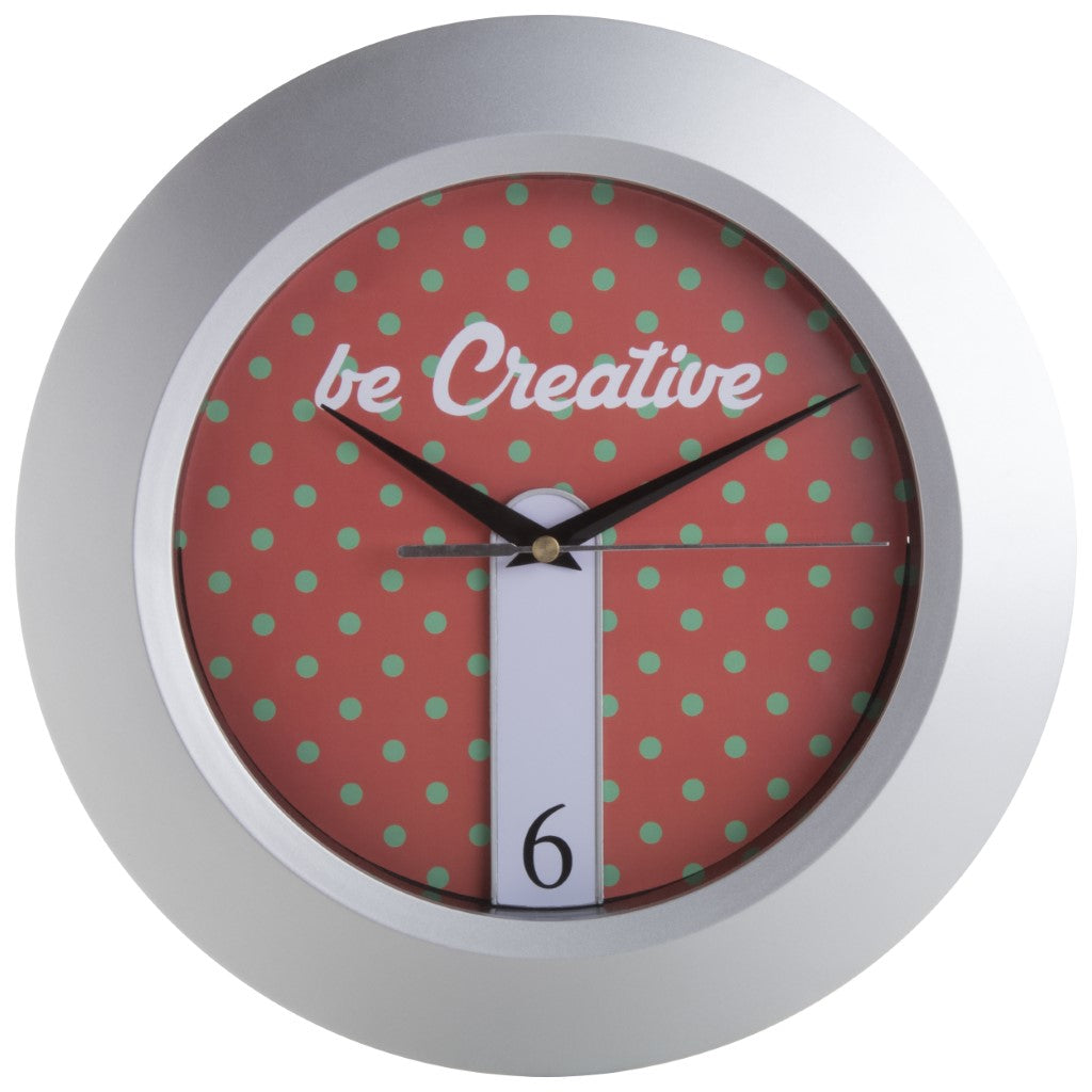 Stenska ura z belo številčnico, idealna za dotisk, plastika srebrne barve, baterija ni priložena, Ø280mm, črna kartonska škatla