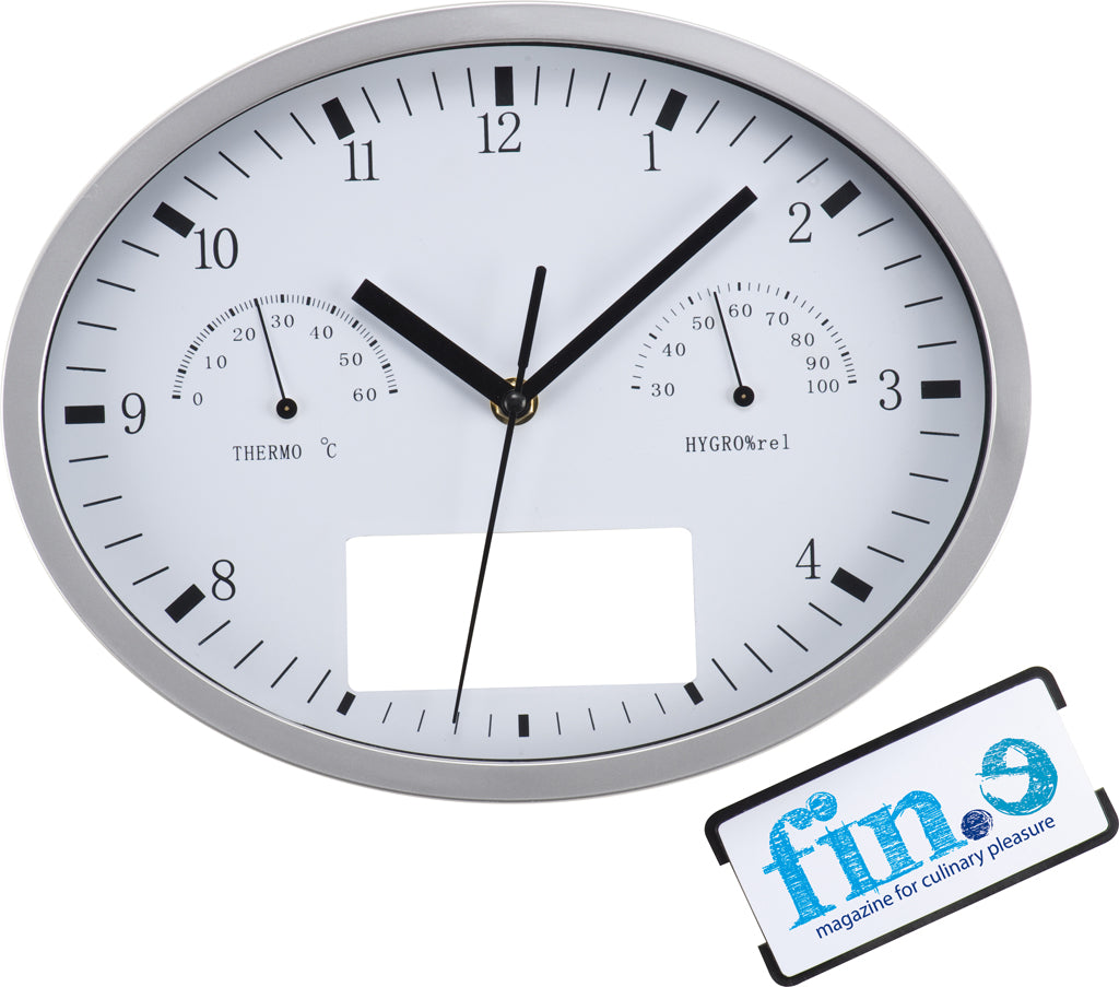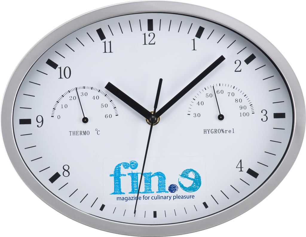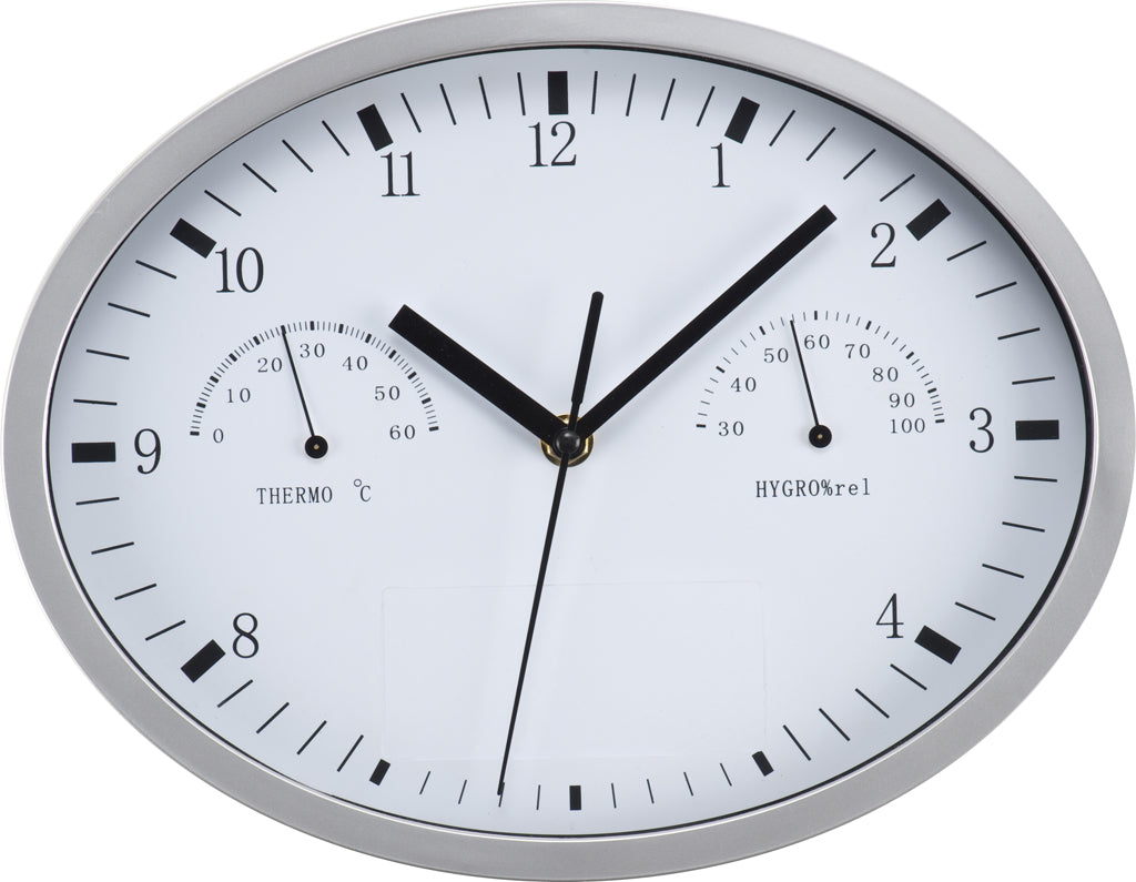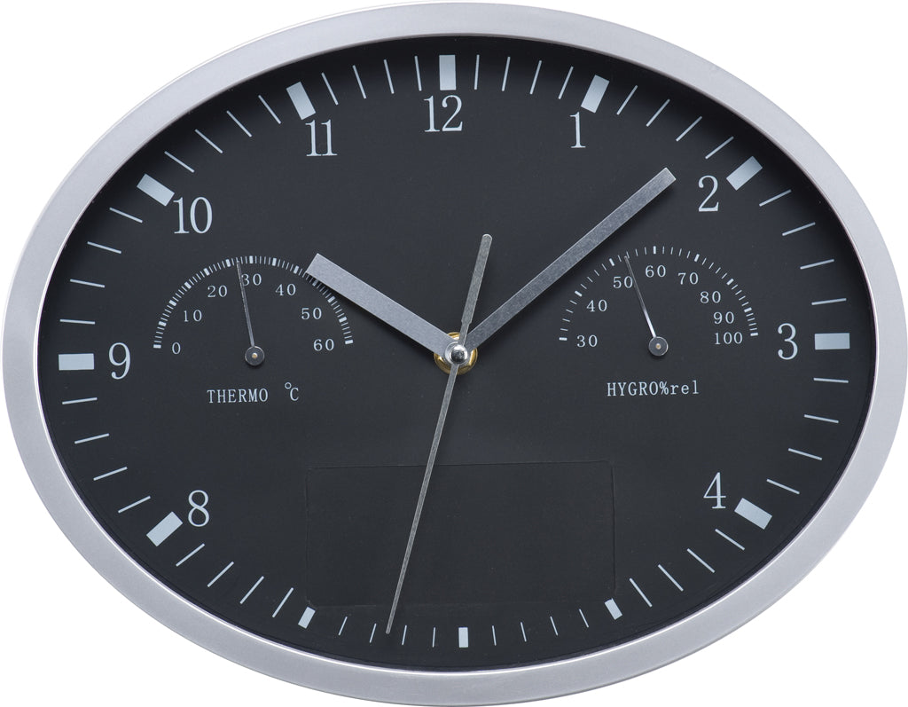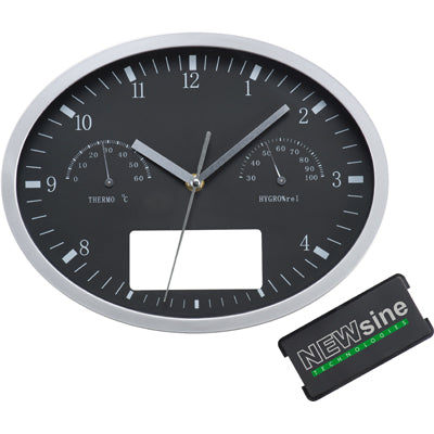 Stenska ura - ovalna, v katero lahko tudi sami vstavite željeno sporočilo, s higrometrom in termometrom, okvir plastika srebrne barve, baterija ni priložena, 290x220x40mm, kartonska škatla