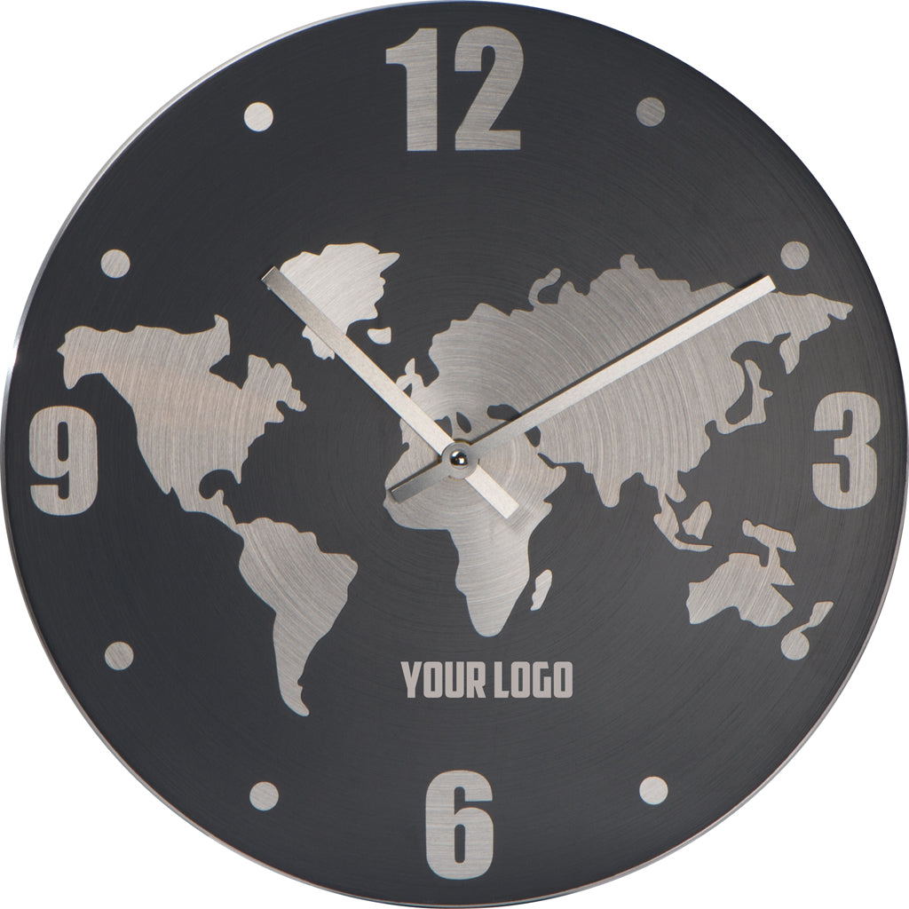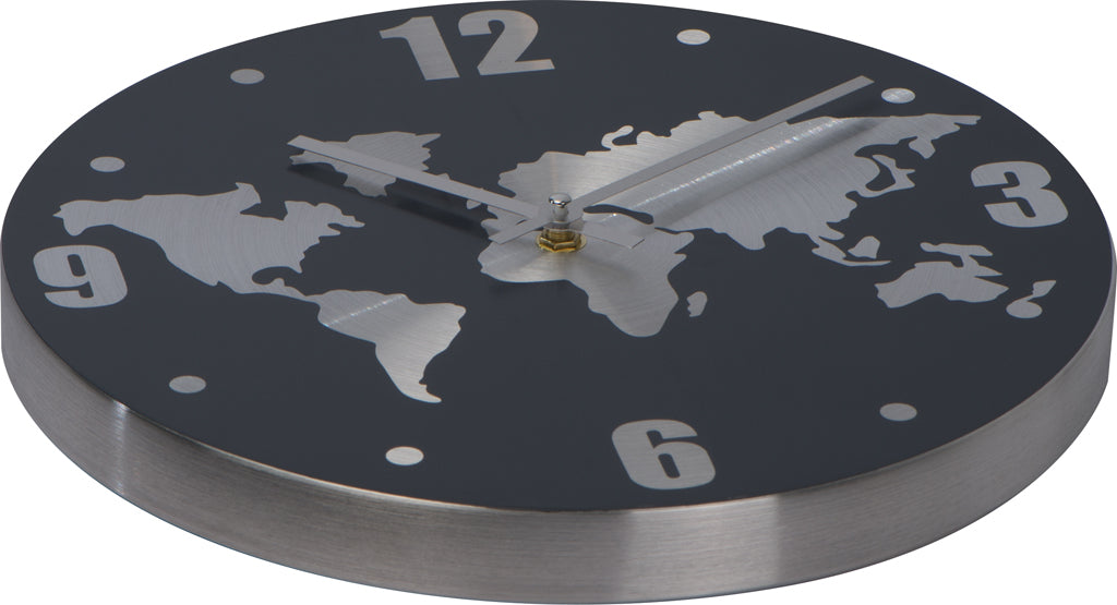 Stenska ura - zemljevid sveta, ohišje aluminij, idealno za gravuro vašega logotipa, baterija ni priložena, Ø300x27mm, kartonska škatla