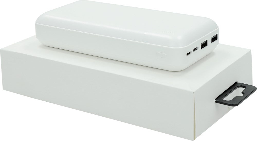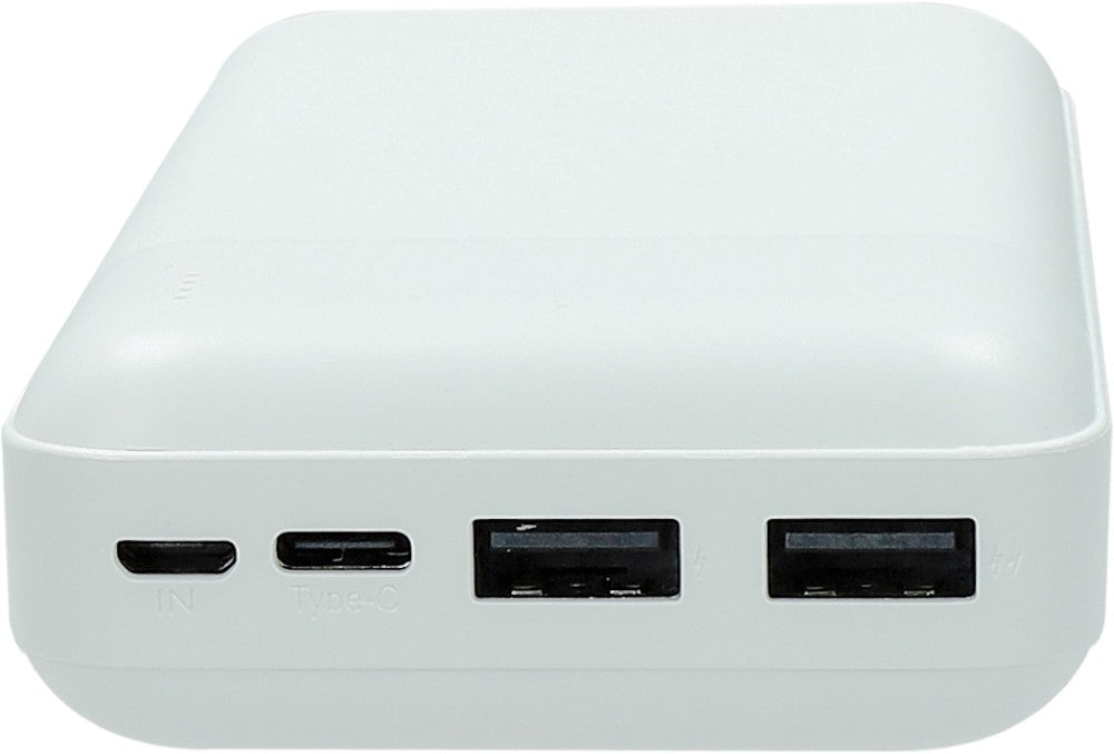 USB Power bank polnilec, 20.000mAh, bela negorljiva ABS plastika, 2 vhoda za polnjenje in 2 USB priključka z mikro in USB Tip-C izhodom, vgrajen LED indikator, priložen USB kabel za polnjenje, 144x65x25mm, kartonska škatla