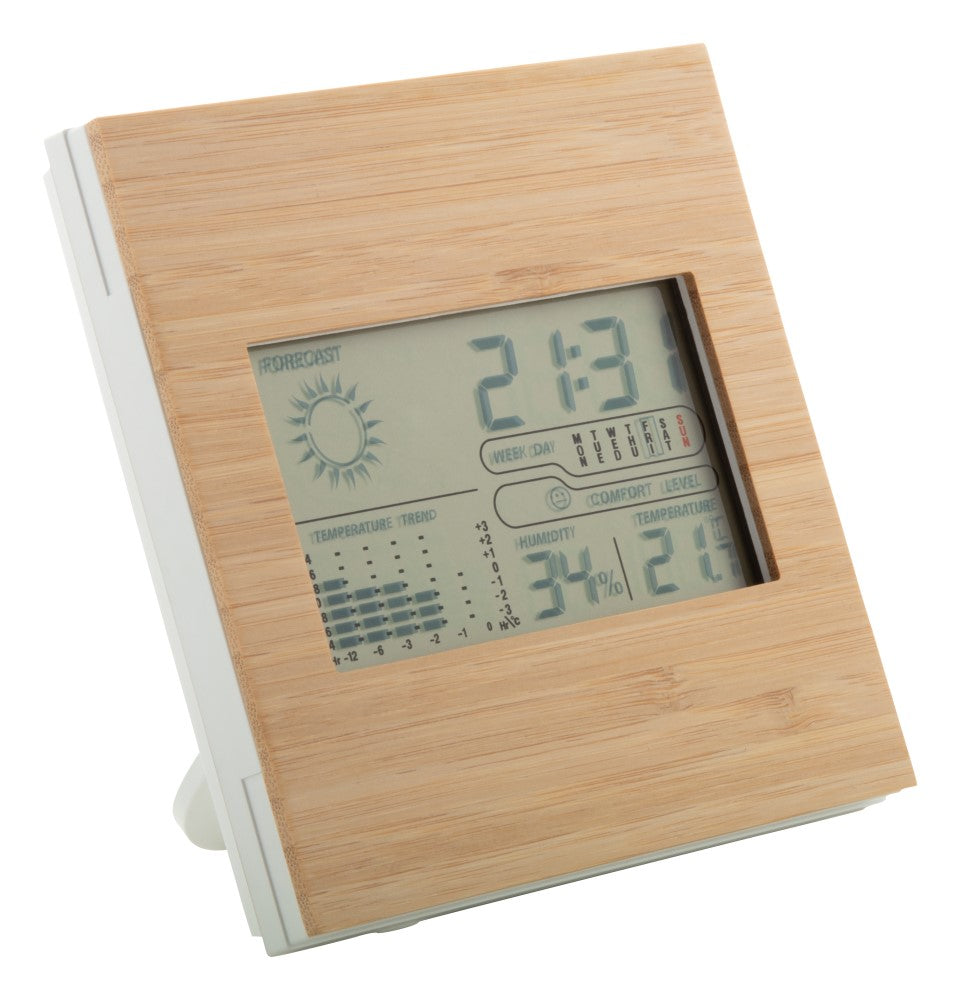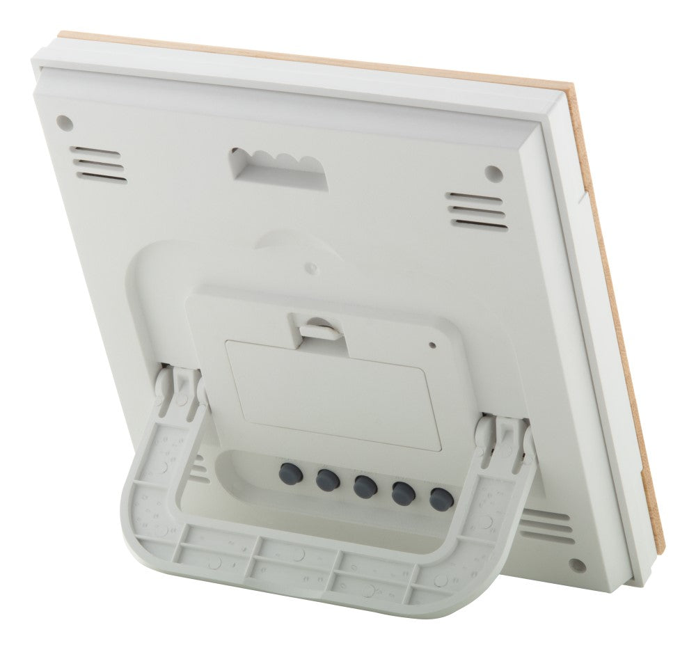 Vremenska postaja, prekrita z bambusom, prikaz vremena in budilka, higrometer in termometer, brez 2 AAA baterij, ABS plastika bele barve, 130x130x23mm, kartonska škatla