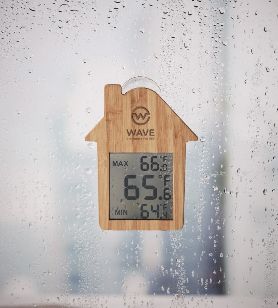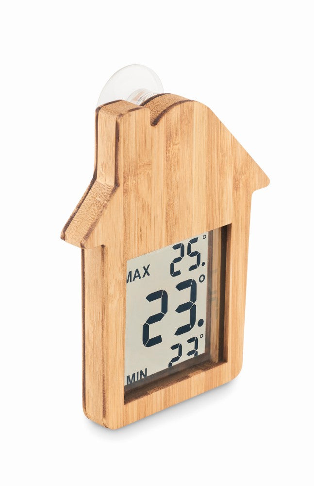 Vremenska postaja, bambus, merjenje zunanje in notranje temperature, možnost pritrditve na steklo, baterija priložena,120x90x25mm, kartonska škatla