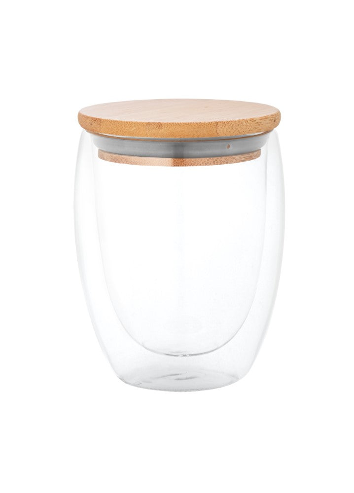 Kozarec, dvojne stene-350ml, borosilikatno steklo, Ø91x119mm, bambus pokrov-podstavek, dotisk ali gravura posebna cena, kartonska škatla