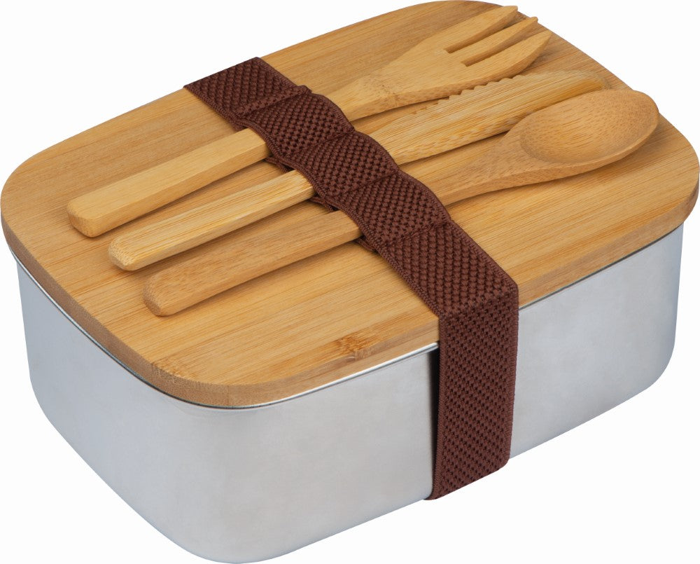 Posoda za malico-nerjaveče jeklo,1000ml, jedilni pribor in pokrov-bambus, silikonski trak, 180x130x72mm