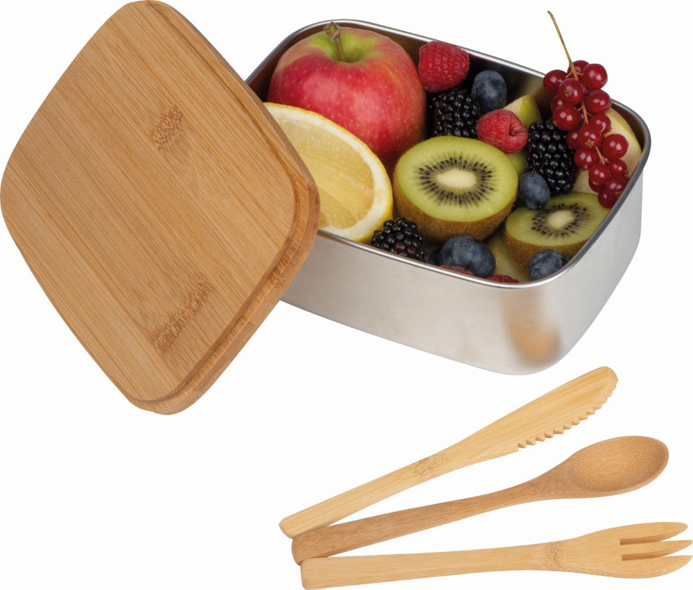 Posoda za malico-nerjaveče jeklo,1000ml, jedilni pribor in pokrov-bambus, silikonski trak, 180x130x72mm