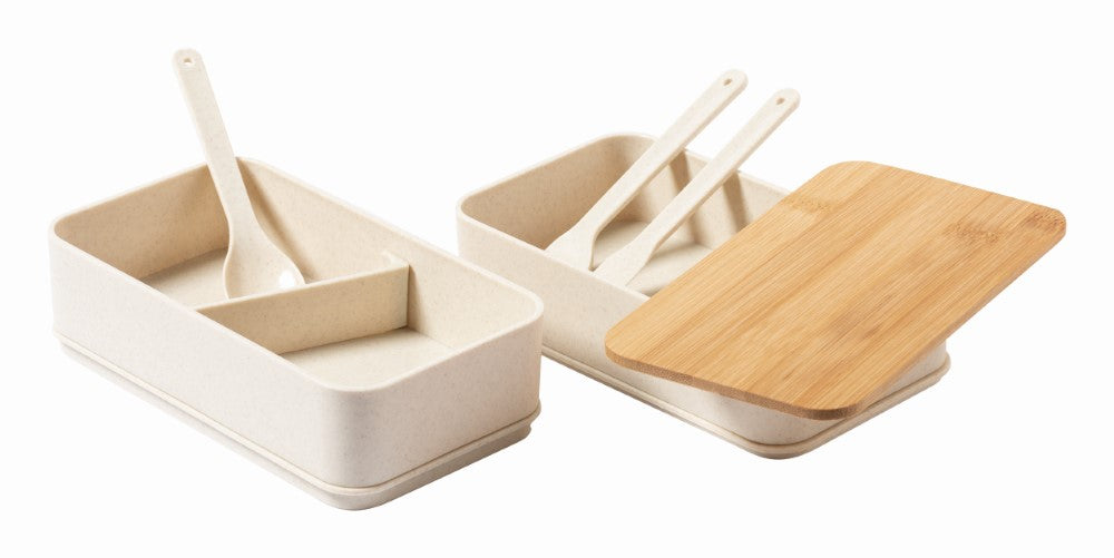 Posoda za malico-polipropilen, dva predela, vsak 700ml, jedilni pribor, bambus pokrov in elastični trak,180x106x96mm