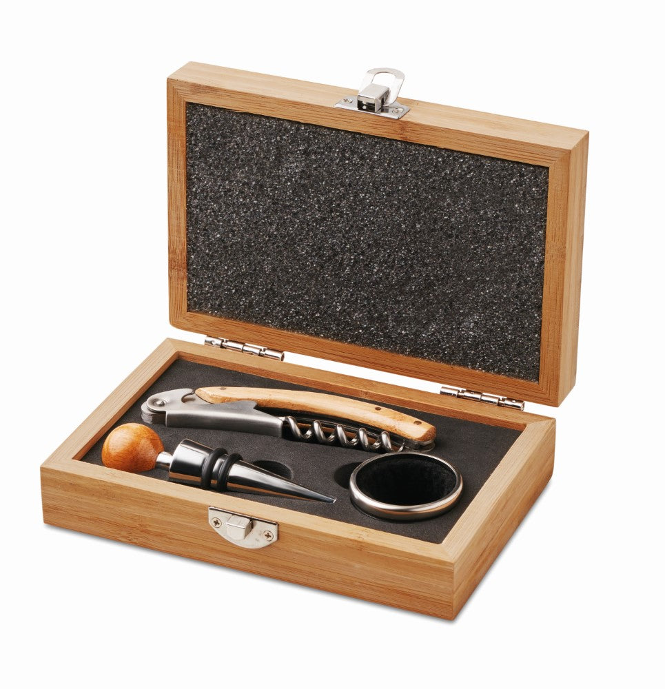 Set za vino, vse bambus in nerjaveča kovina: ovratnik za steklenico, odpirač, zamašek, škatla: 160x100x45mm