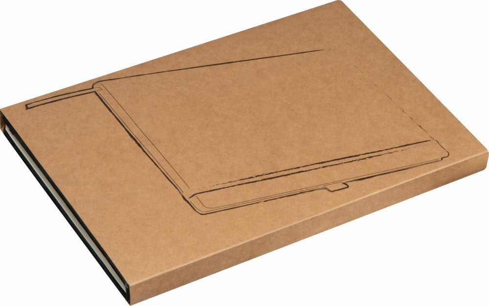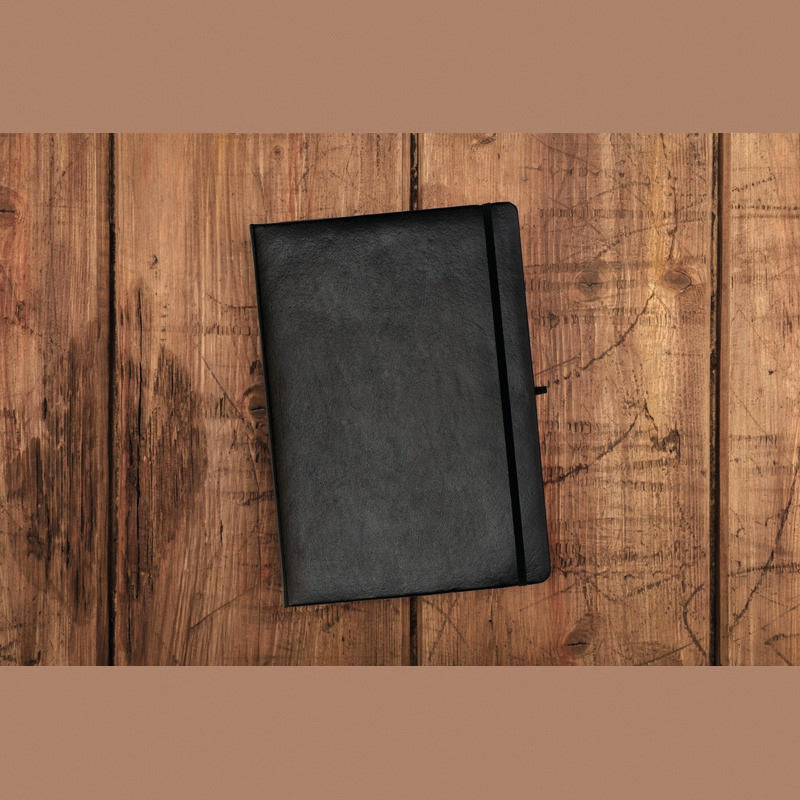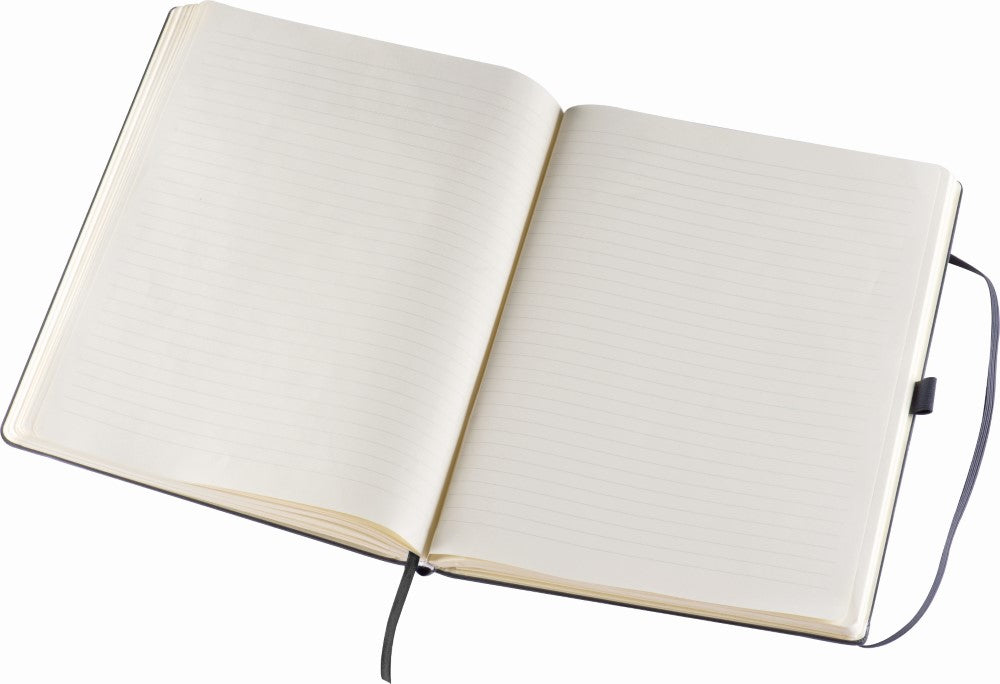 Notesnik A4, 80 listni, s črtami, dodan žepek za dokumente, trde platnice podložene s peno in prekrite s črnim umetnim usnjem, 202x292x19mm, kartonski ovitek
