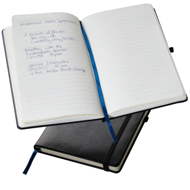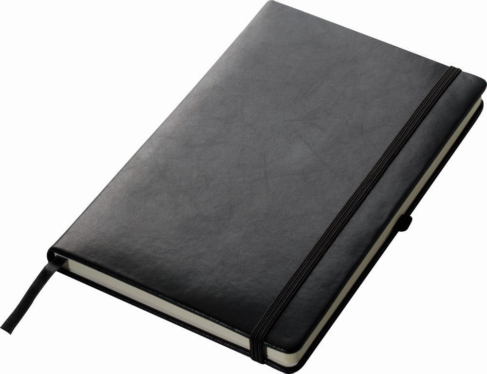Notesnik A5, 80 listni, s črtami, dodan žepek za dokumente, trde platnice podložene s peno in prekrite s črnim umetnim usnjem, 140x210x22mm, kartonski ovitek