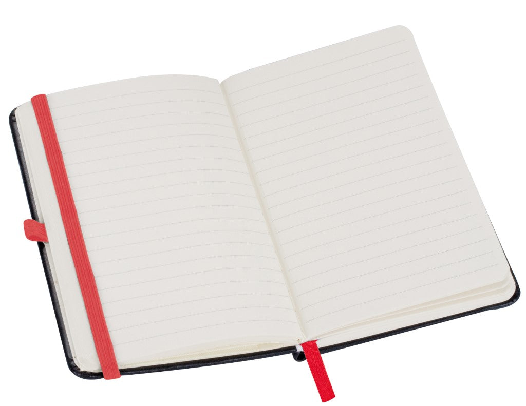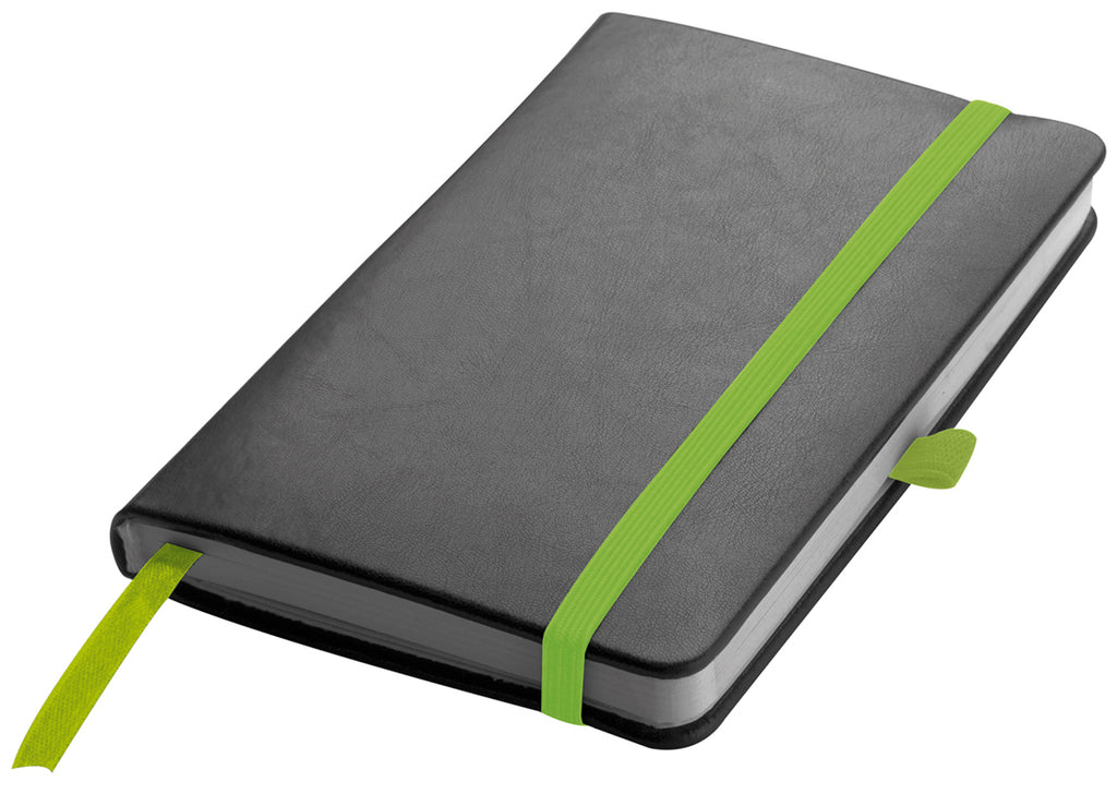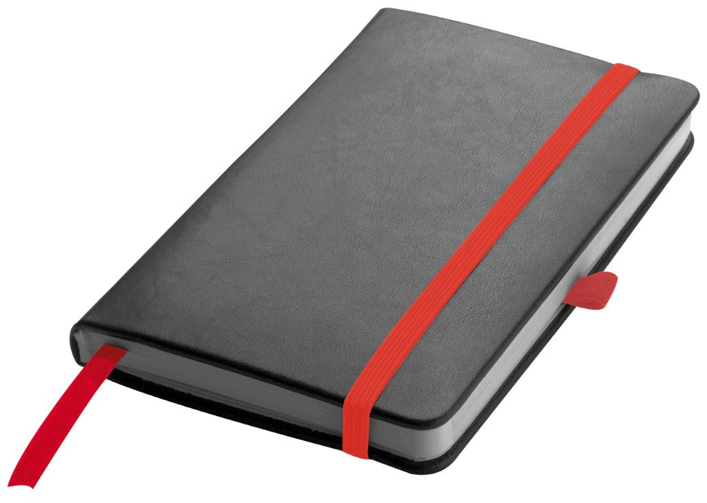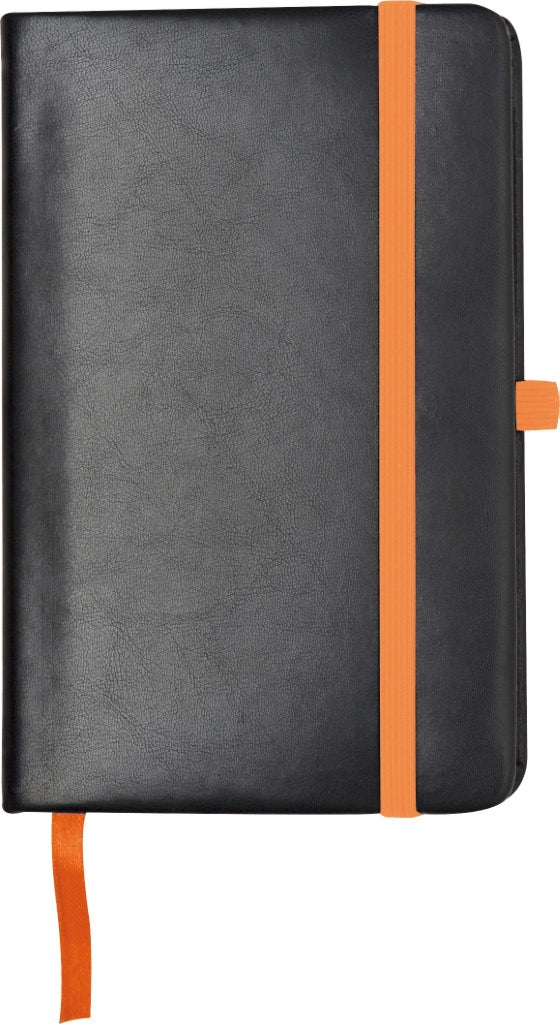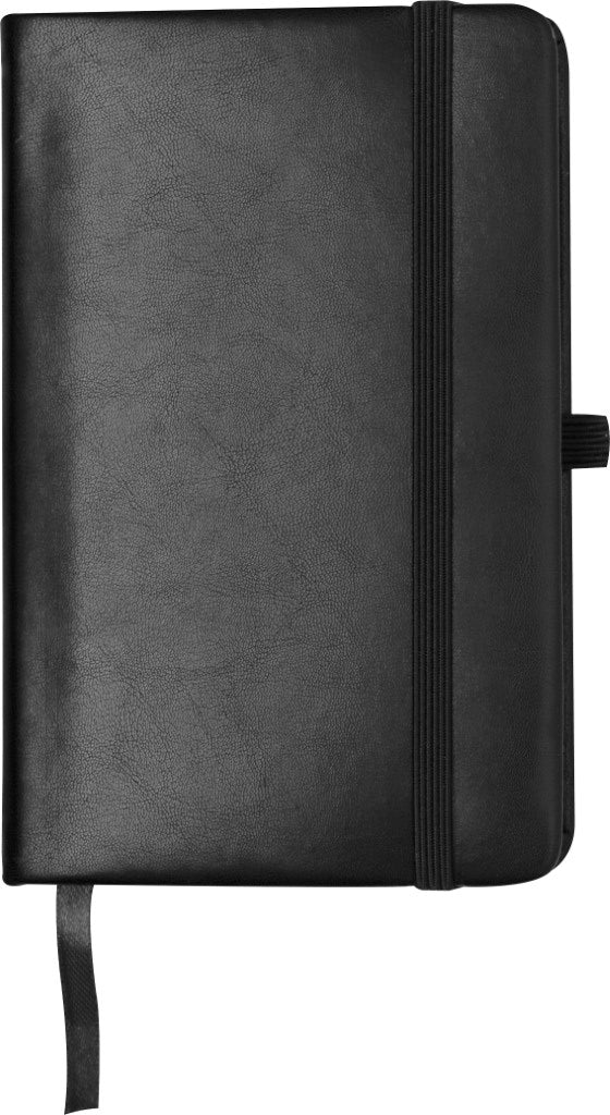 Notesnik A6, s črtami in žepom, 80 listni, trde platnice-umetno usnje, z barvno elastiko, 93x143x16mm, PU vrečka