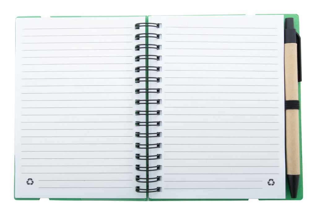 Notesnik A6 s špiralo, 70 listni recikliran papir s črtami, 125 barvnih lističev za označevanje, kemični svinčnik z držalom, 130x145x11 mm