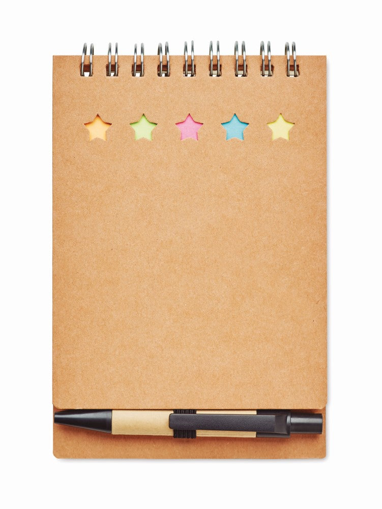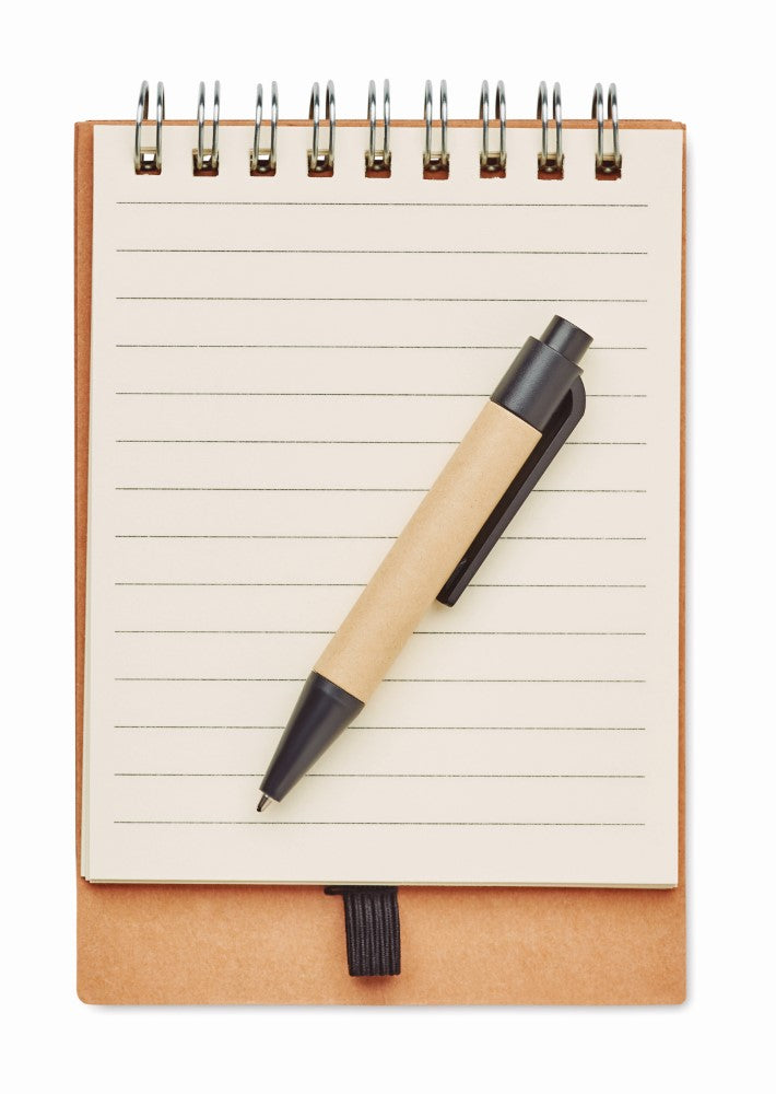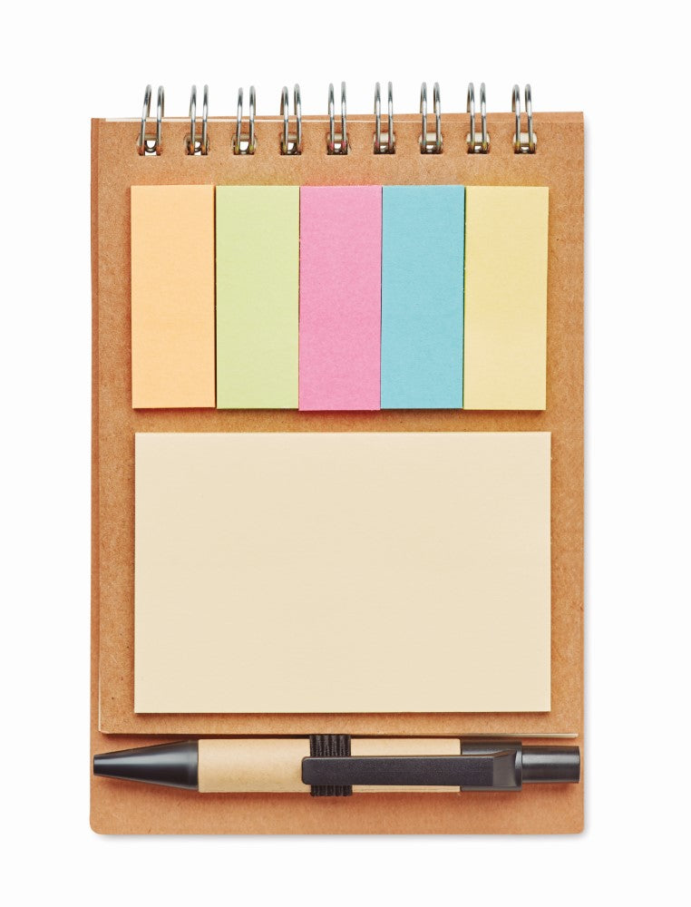 Notesnik s špiralo, kemičnim svinčnikom, 40 listnim recikliranim papirjem s črtami in samolepilnimi lističi, 130x90x15mm