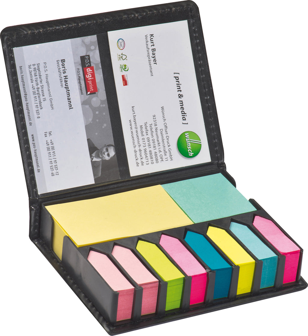 200 samolepljivih lističev, različne velikosti in barve, v črni plastični škatli s predelom za vizitke, 30x103x30mm, PU vrečka