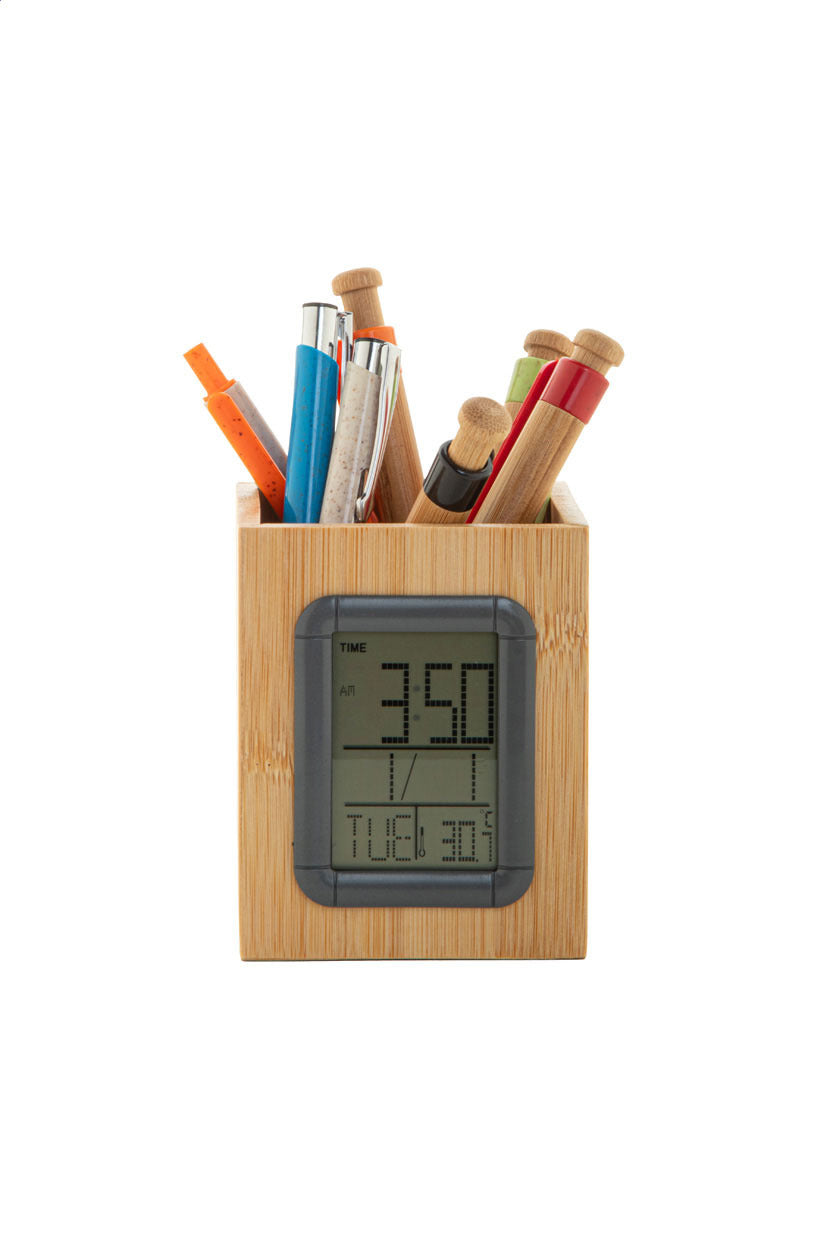 Bambus stojalo za pisala, budilka z datumom in termometrom, bateriji priloženi, 76x78x95mm, kartonska škatla