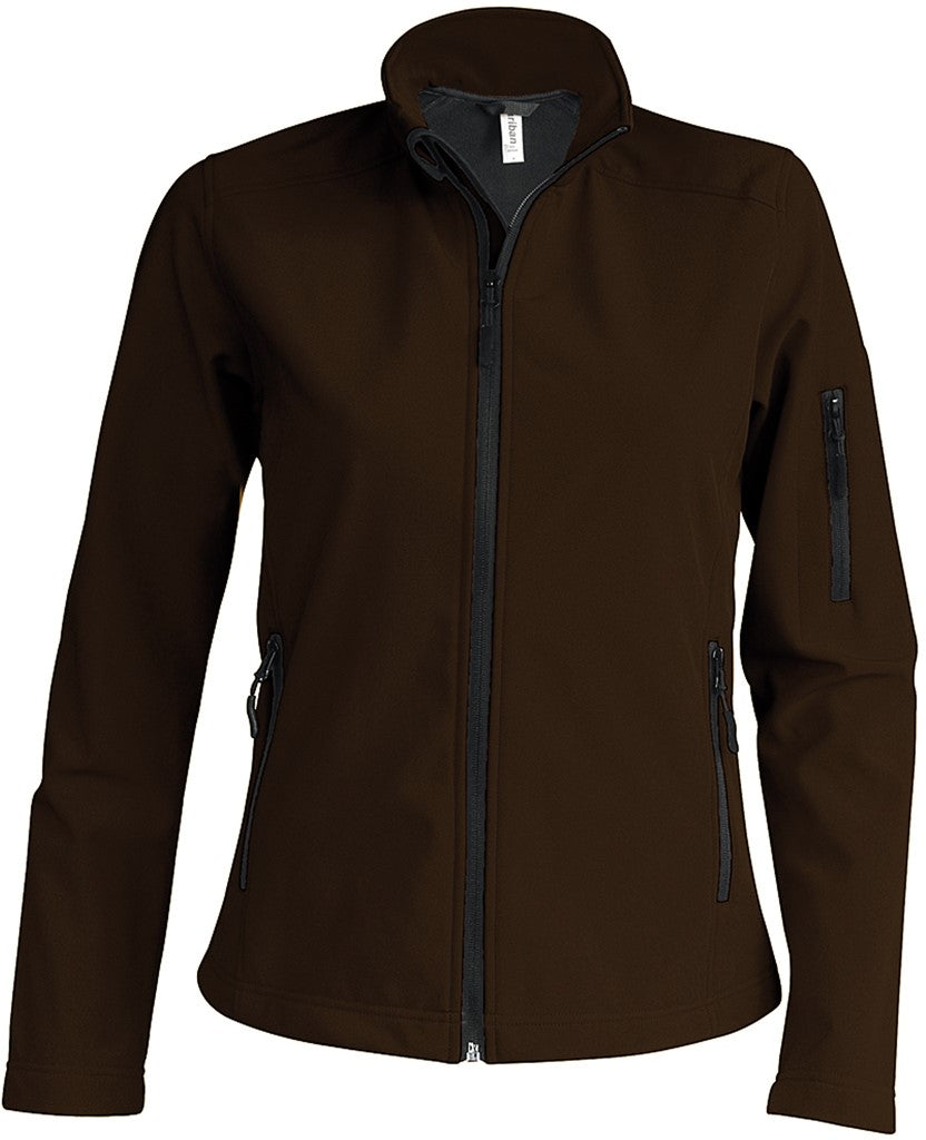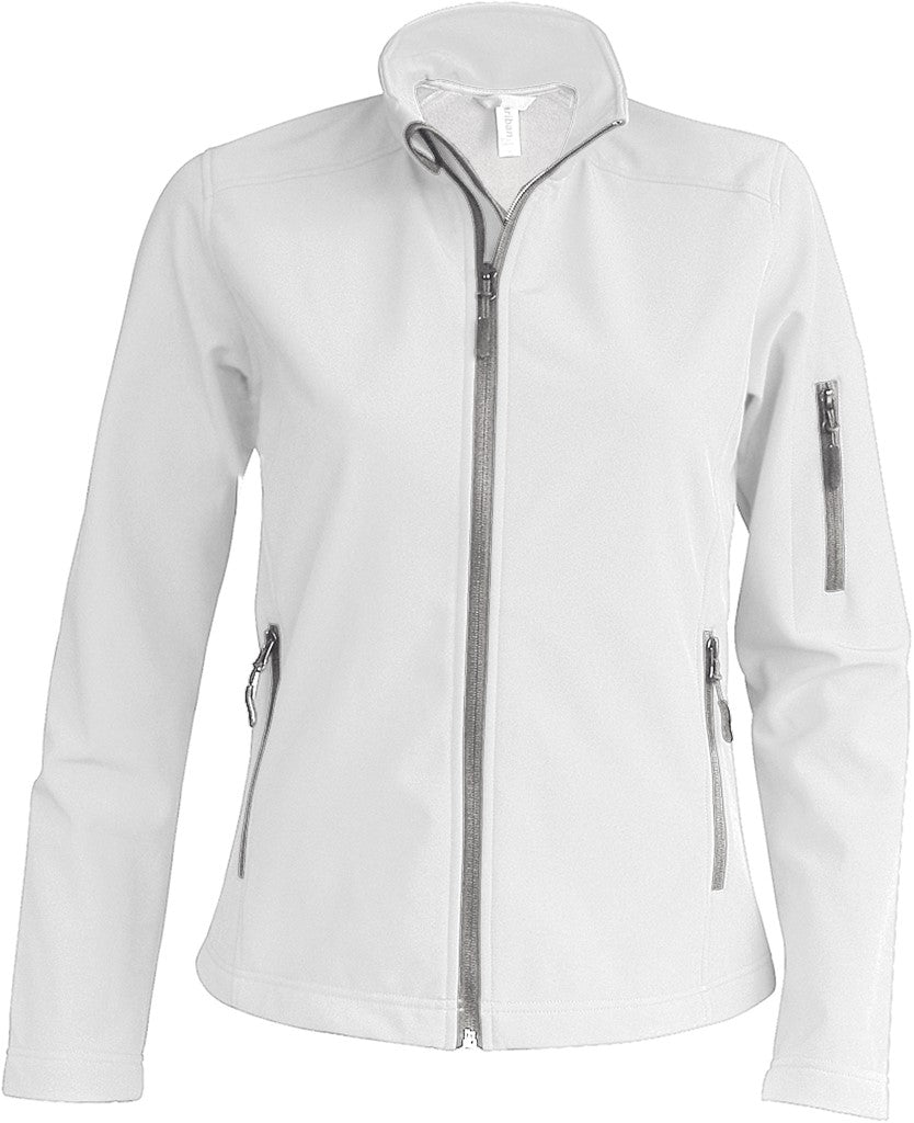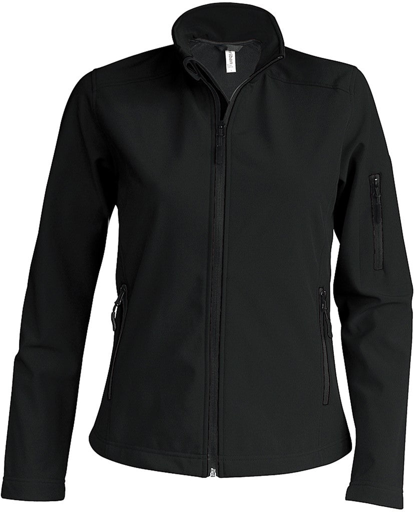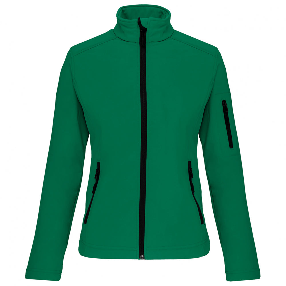 Ženska Soft Shell jakna, 95% poliester in 5% elastan, 300g/m2, vodoodbojna do 8.000mm, zračna do 3000g/m2/24h, s tremi plastmi mehkih materialov, odporna na veter, dva transka in žep na rokavu z zadrgami, telirana