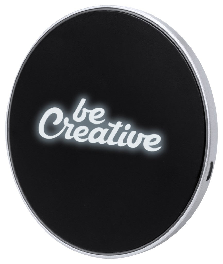 Okrogel brezžični polnilec za telefone z QI tehnologijo, črn, z gravuro se pokaže vaš logotip v beli LED svetlobi, izhodna moč(5W), plastika, Ø100x7mm, kartonska škatlica