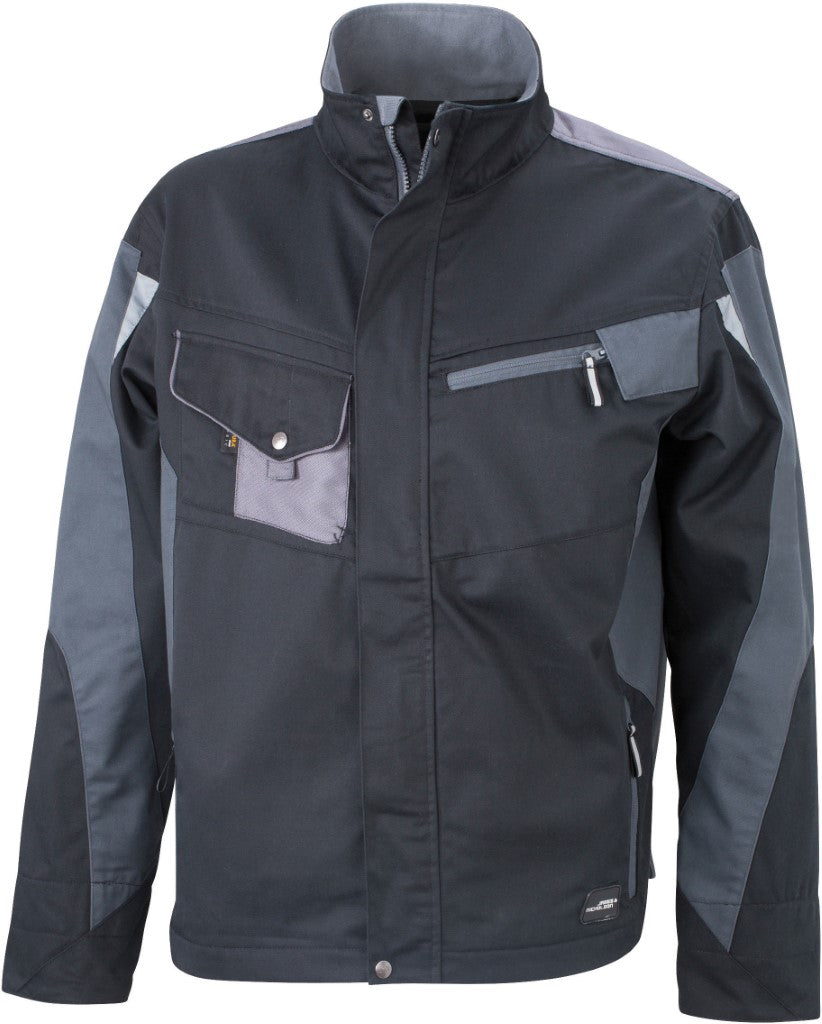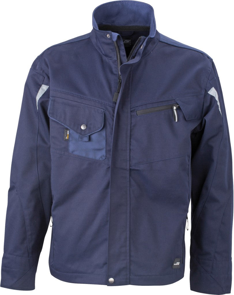 Moška delovna jakna, 65% poliester in 35% bombaž, kontrastni detajli iz poliamida, zelo trpežna in kvalitetna, veliko žepov, notranjost ovratnika iz mehkega flisa