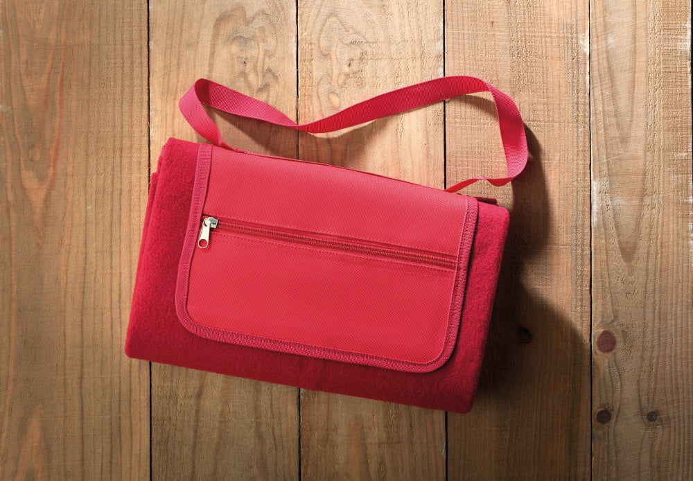 Piknik odeja, zložena kot torbica z ročem, flis - poliester, podložena s PEVA nepremočljivo plastiko,120x150cm, PU vrečka